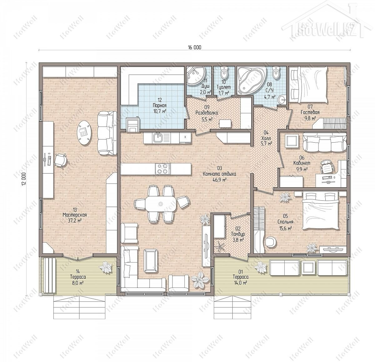 Одноэтажный дом 16 на 12 метров, общей площадью 203 м2, из СИП панелей, с сауной, террасой и спальней на первом этаже.