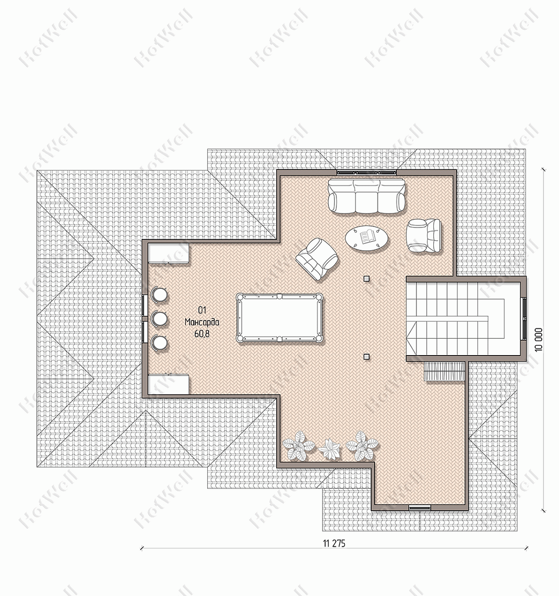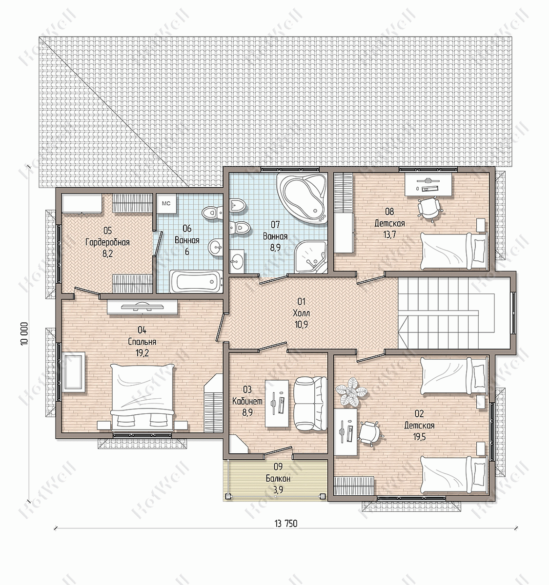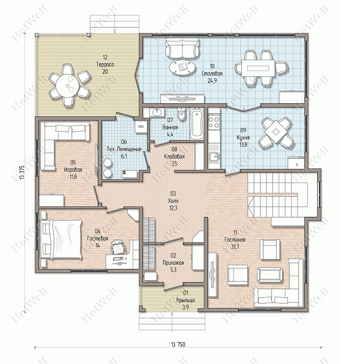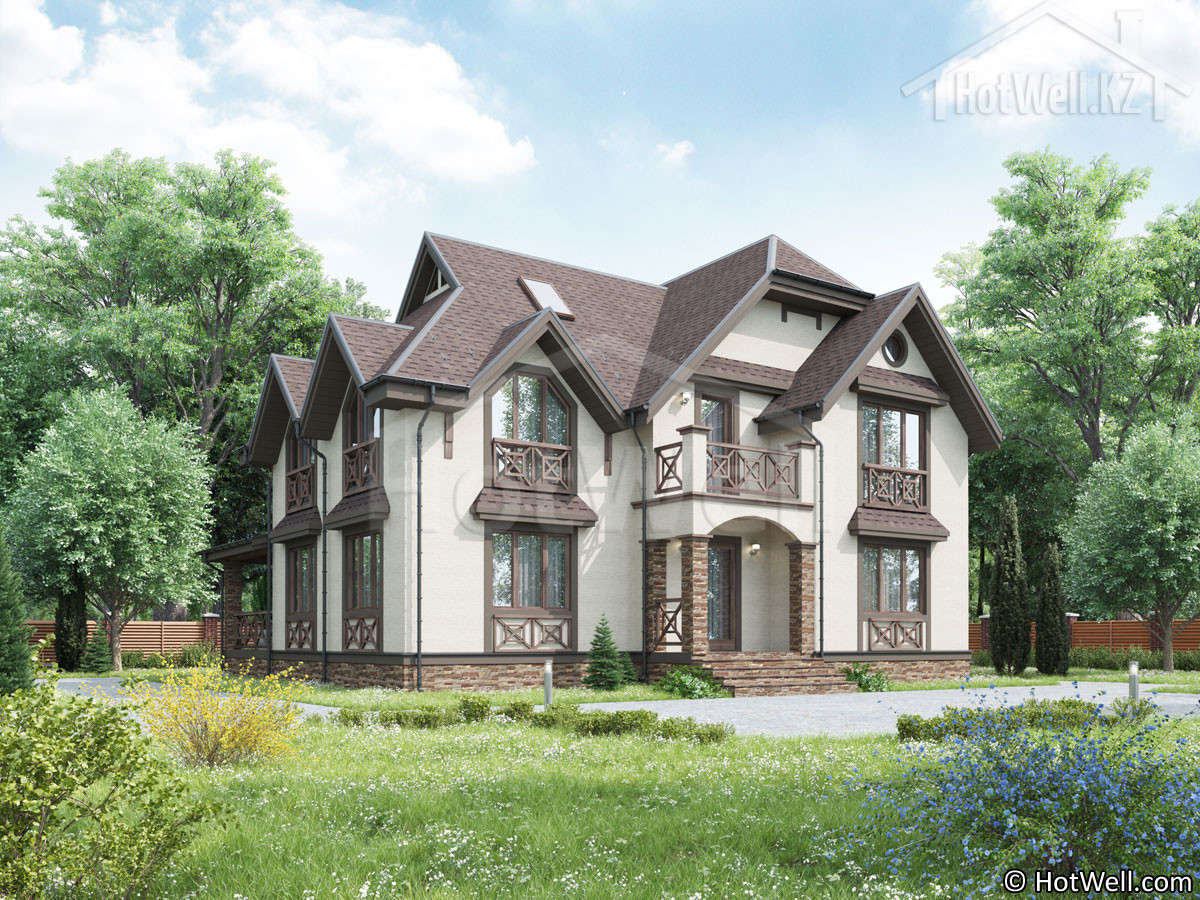 Трехэтажный дом 14 на 13 метров, общей площадью 353 м2, из СИП панелей, с бойлерной, террасой и спальней на первом этаже.