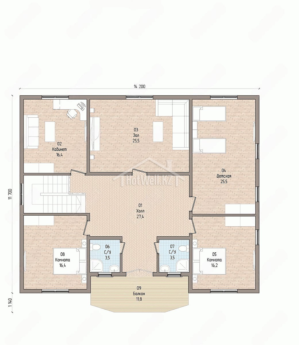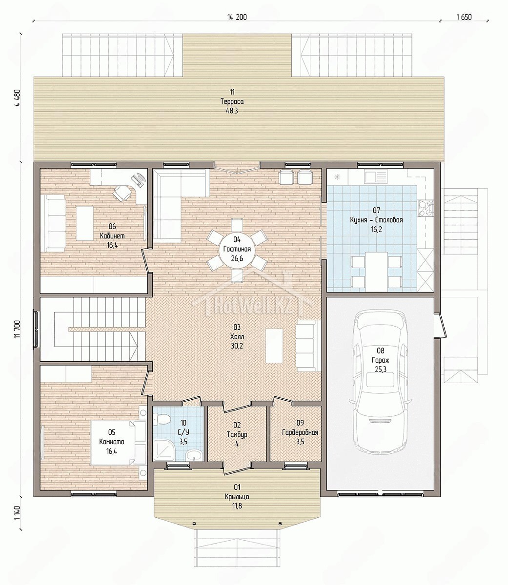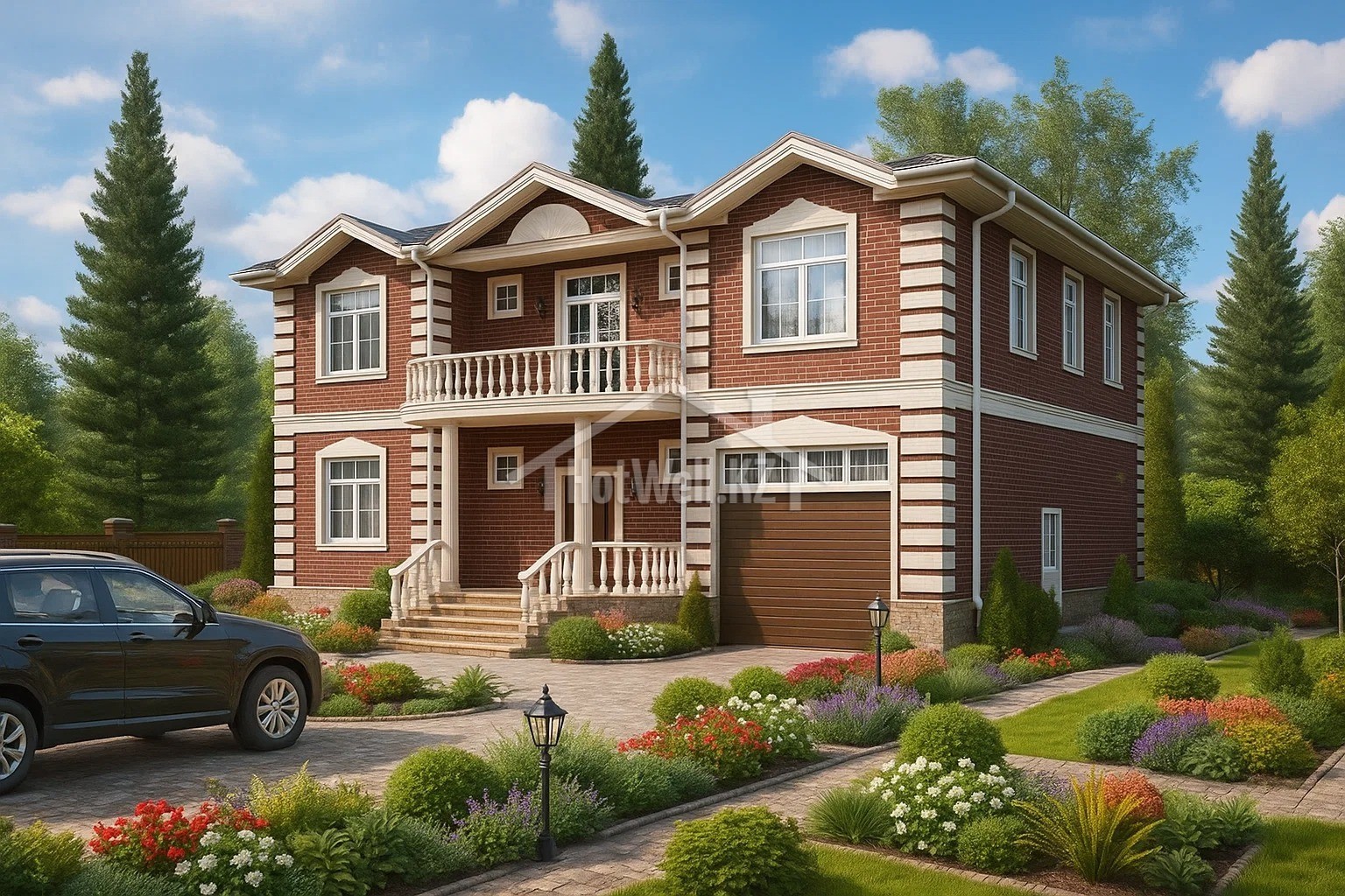 Двухэтажный дом 17 на 14 метров, общей площадью 393 м2, из СИП панелей, с гаражом, террасой, балконом и спальней на первом этаже.