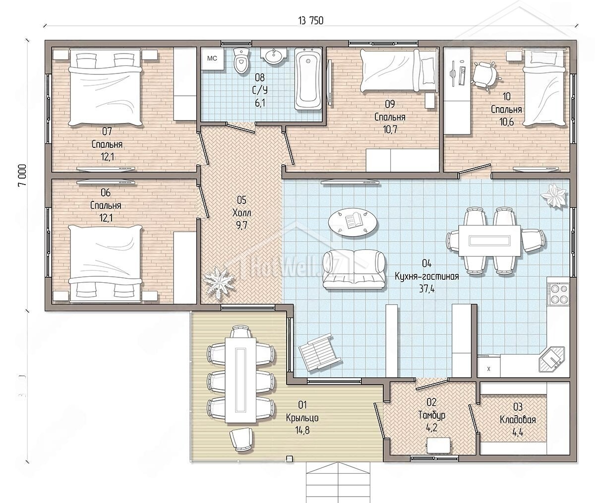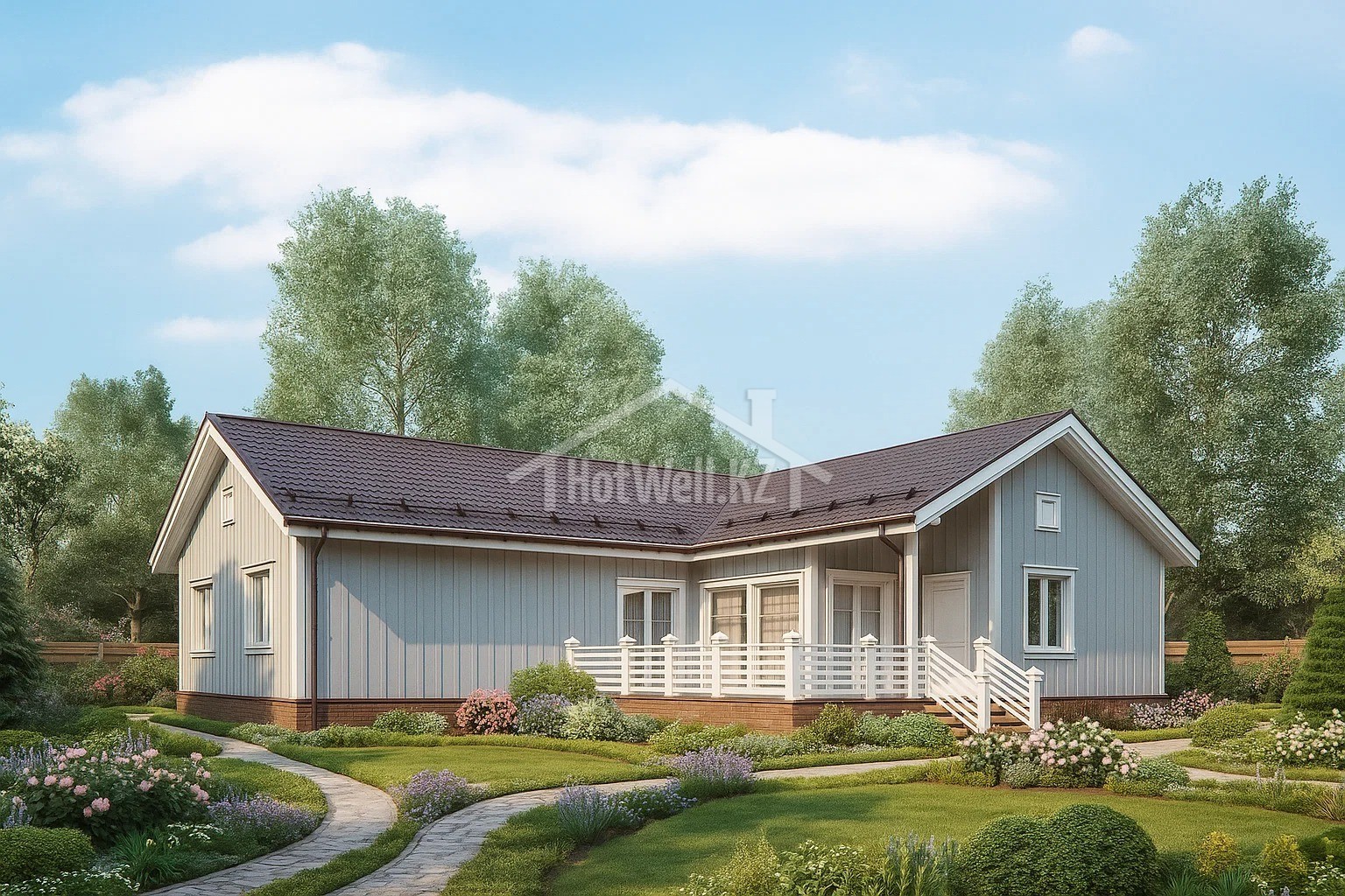 Одноэтажный дом 14 на 11 метров, общей площадью 135 м2, из СИП панелей, с террасой и спальней на первом этаже.
