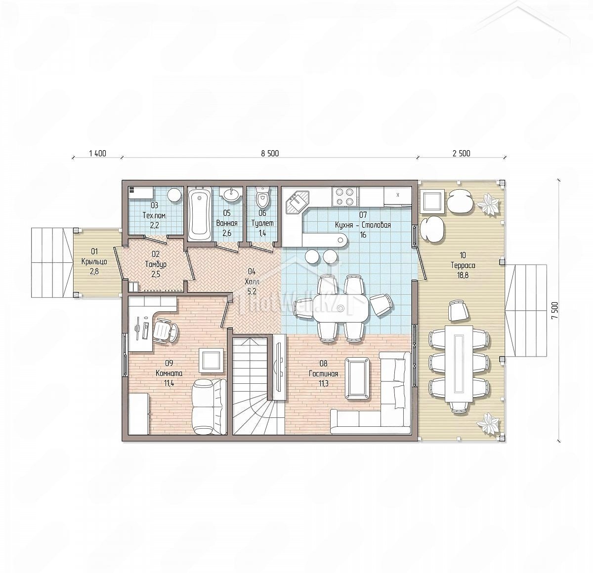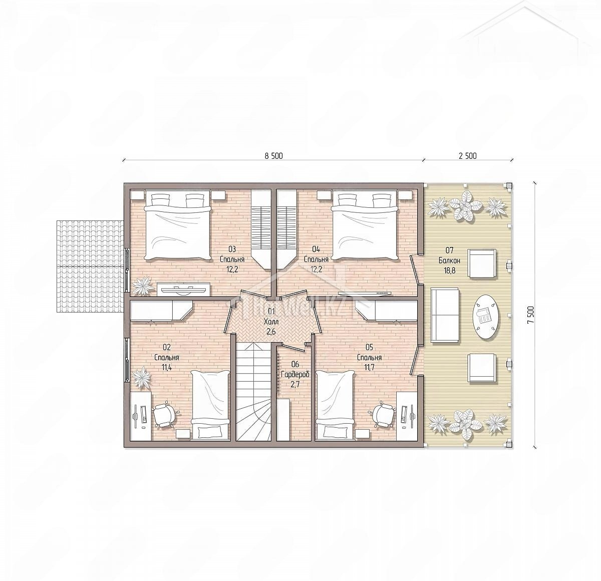 Дом с мансардой 12 на 8 метров, общей площадью 168 м2, из СИП панелей, с бойлерной, террасой, балконом и спальней на первом этаже.