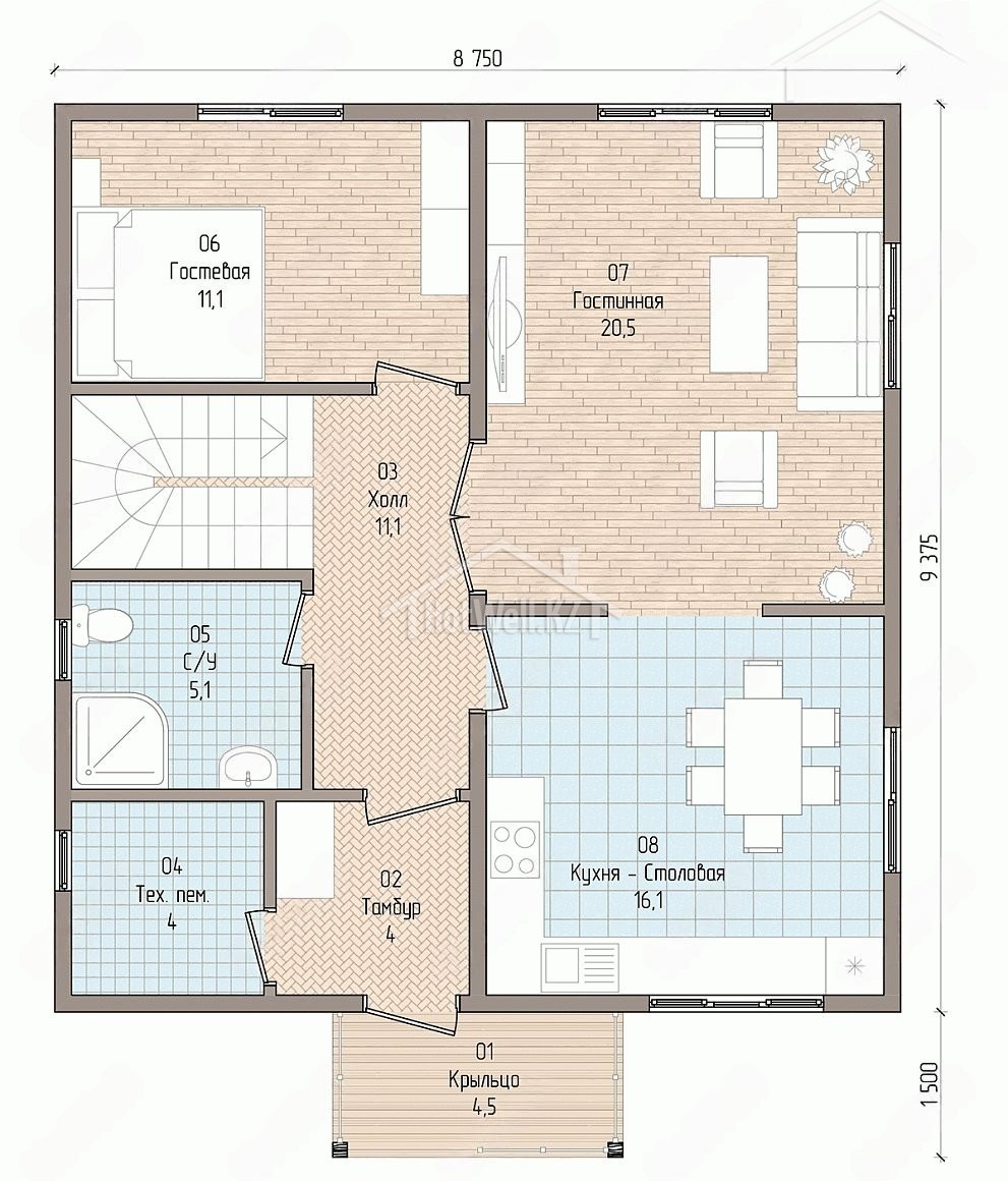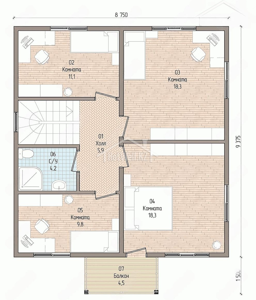 Двухэтажный дом 11 на 9 метров, общей площадью 173 м2, из СИП панелей, с бойлерной, балконом и спальней на первом этаже.