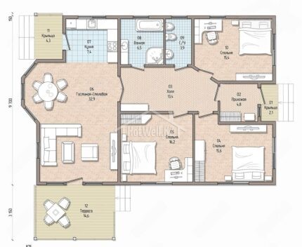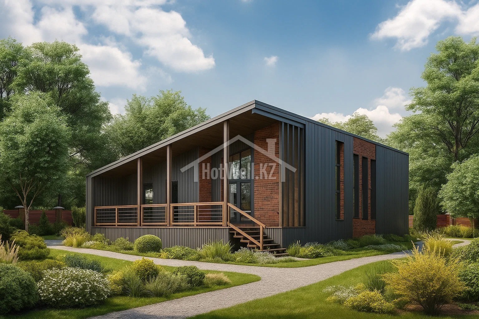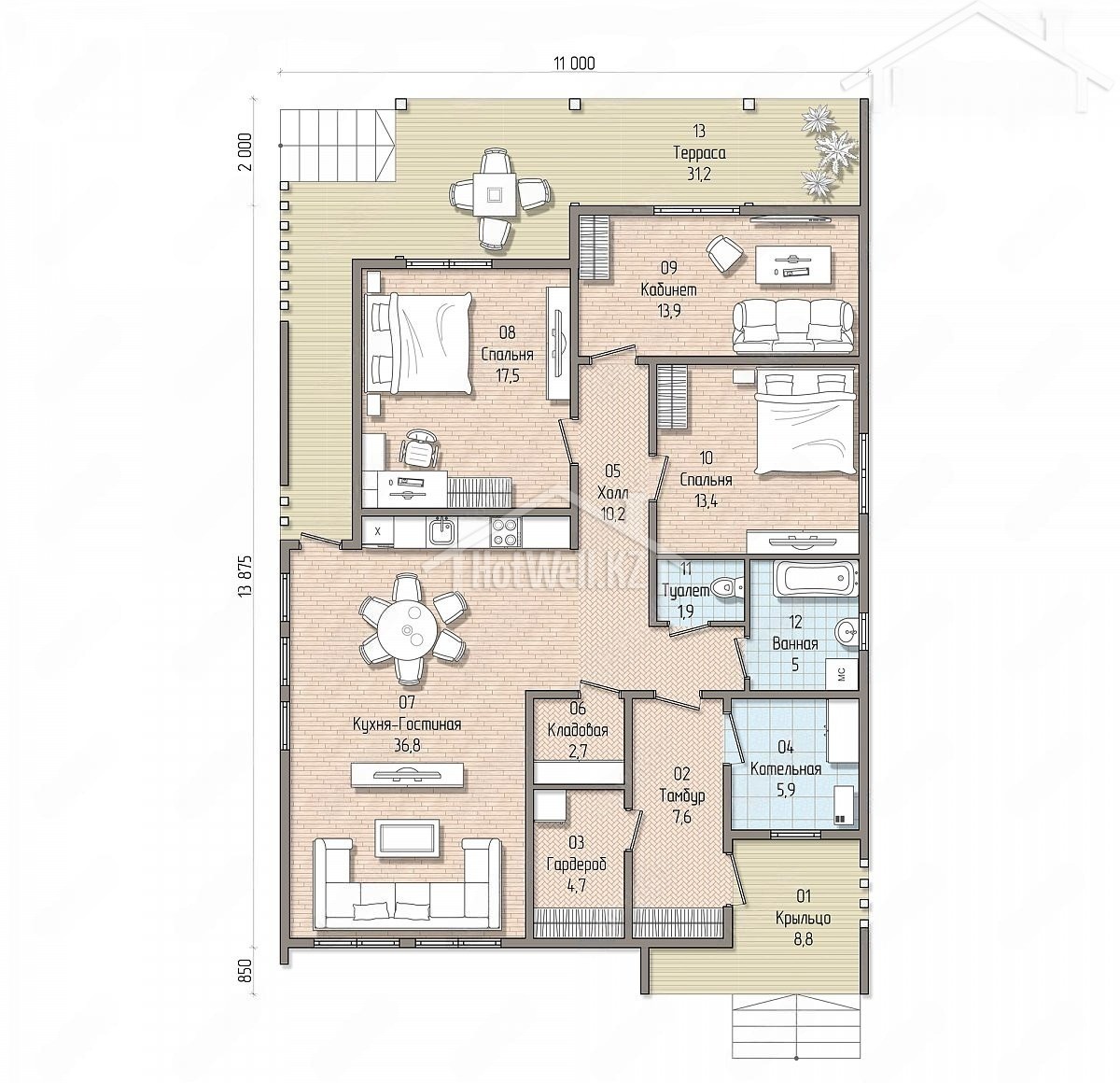 Одноэтажный дом 17 на 11 метров, общей площадью 175 м2, из СИП панелей, с бойлерной, террасой и спальней на первом этаже.