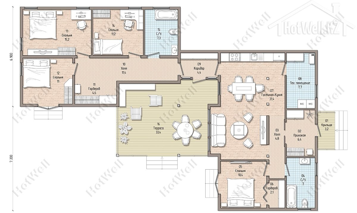 Одноэтажный дом 22 на 14 метров, общей площадью 190 м2, из СИП панелей, с бойлерной, террасой и спальней на первом этаже.