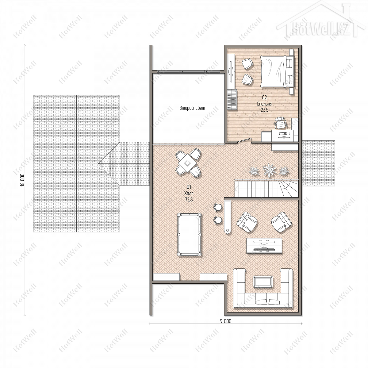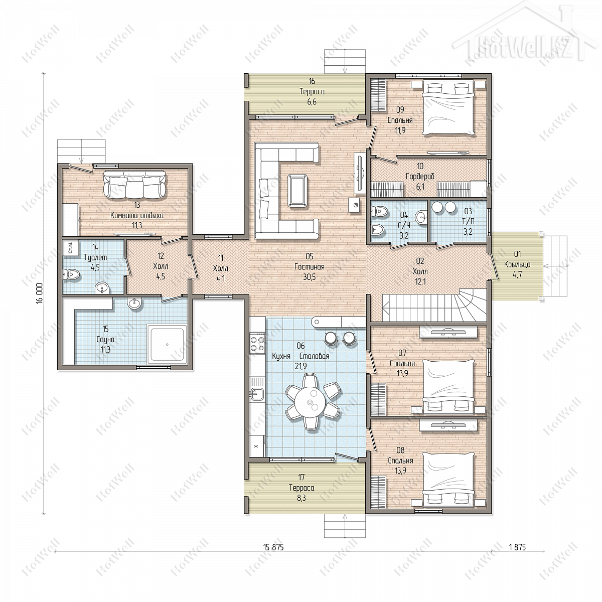Дом с мансардой 16 на 18 метров, общей площадью 319 м2, из СИП панелей, с сауной, бойлерной, террасой, вторым светом и спальней на первом этаже.