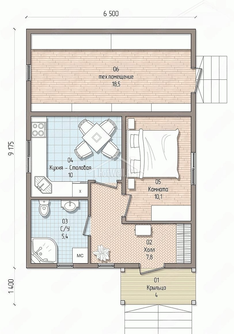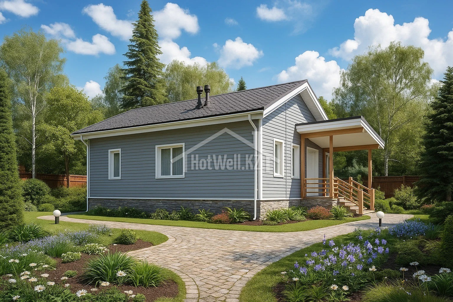 Одноэтажный дом 11 на 7 метров, общей площадью 64 м2, из СИП панелей, со спальней на первом этаже.