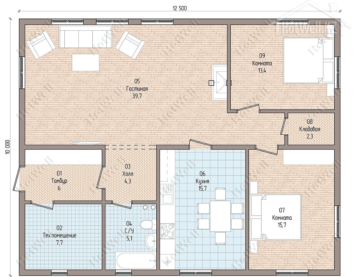 Одноэтажный дом 13 на 10 метров, общей площадью 125 м2, из СИП панелей, с бойлерной и спальней на первом этаже.