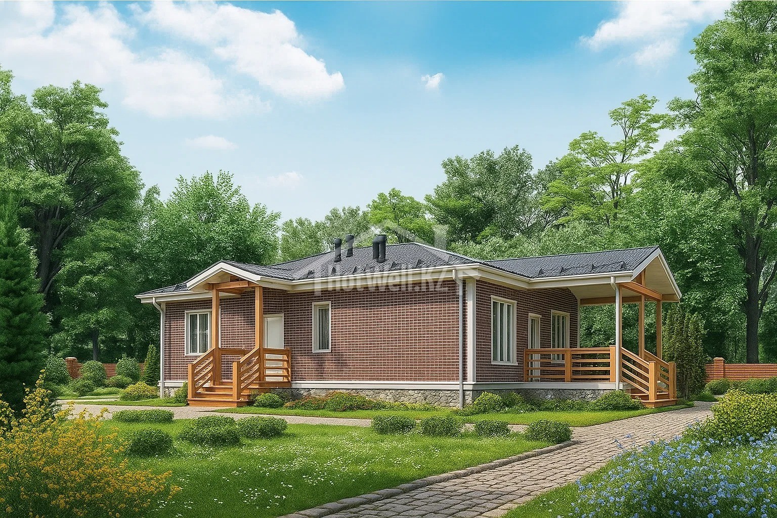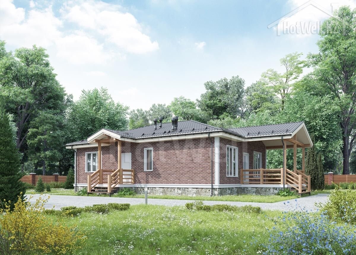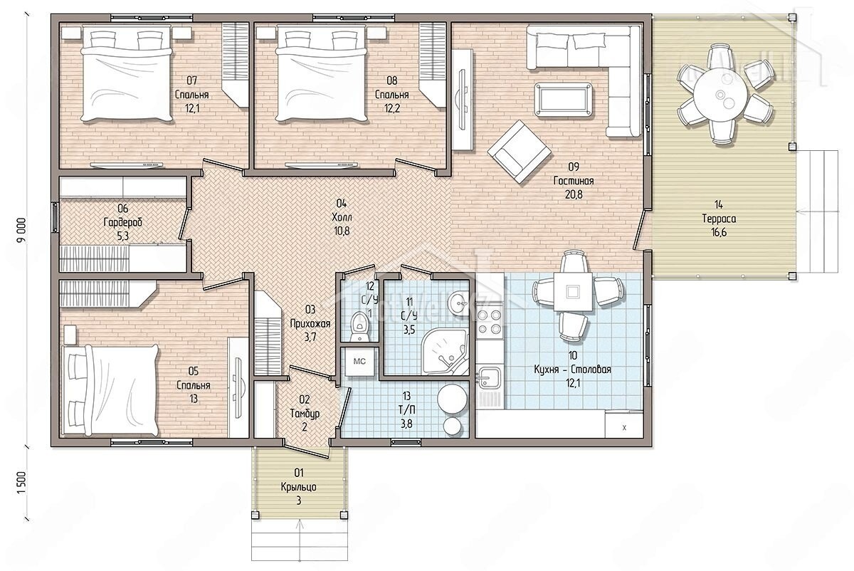 Одноэтажный дом 16 на 11 метров, общей площадью 132 м2, из СИП панелей, с бойлерной, террасой и спальней на первом этаже.