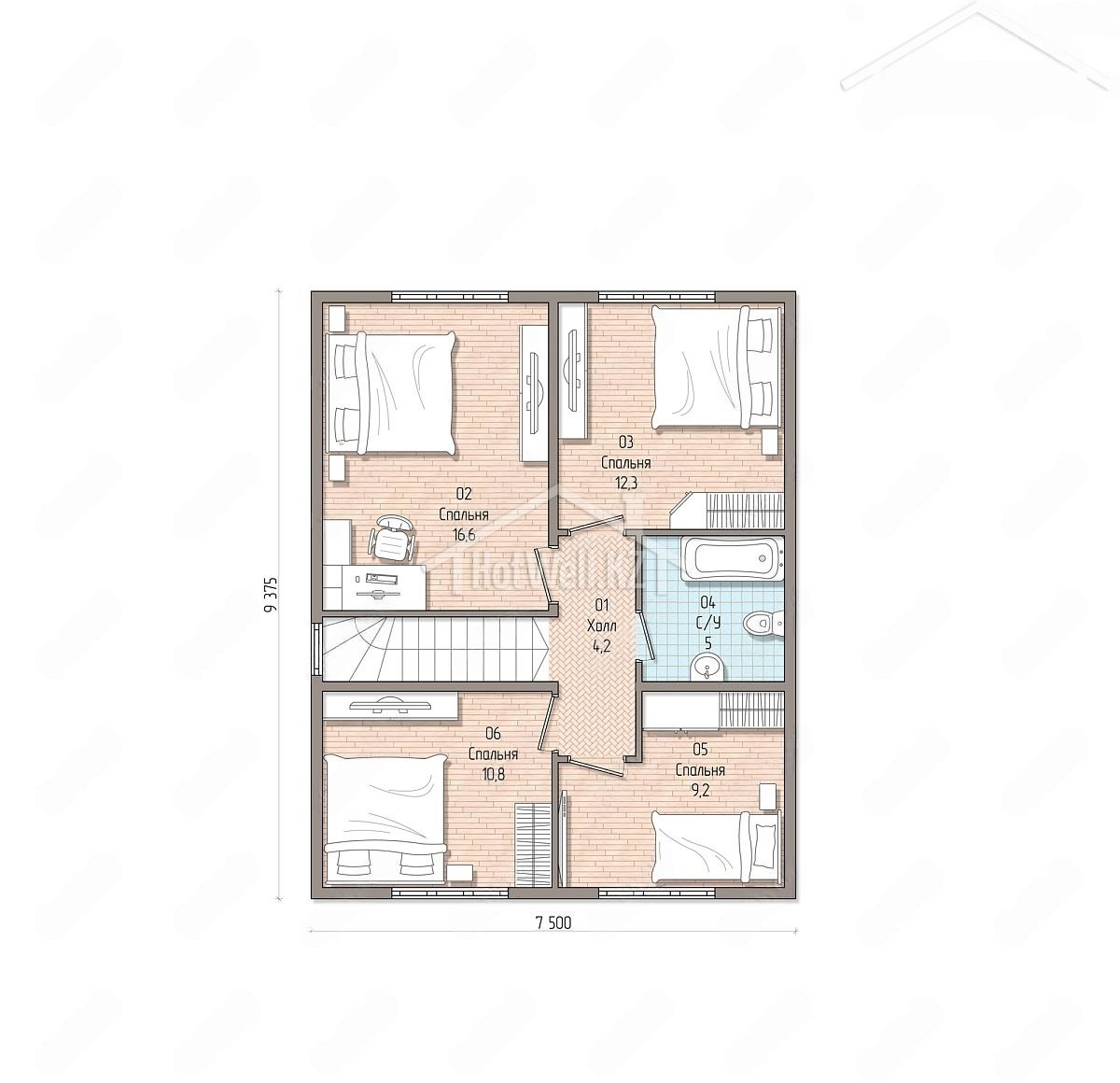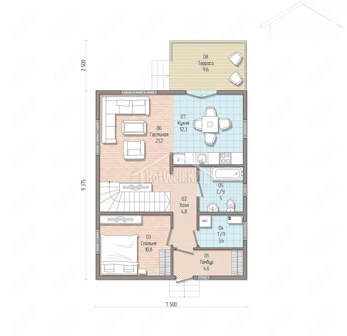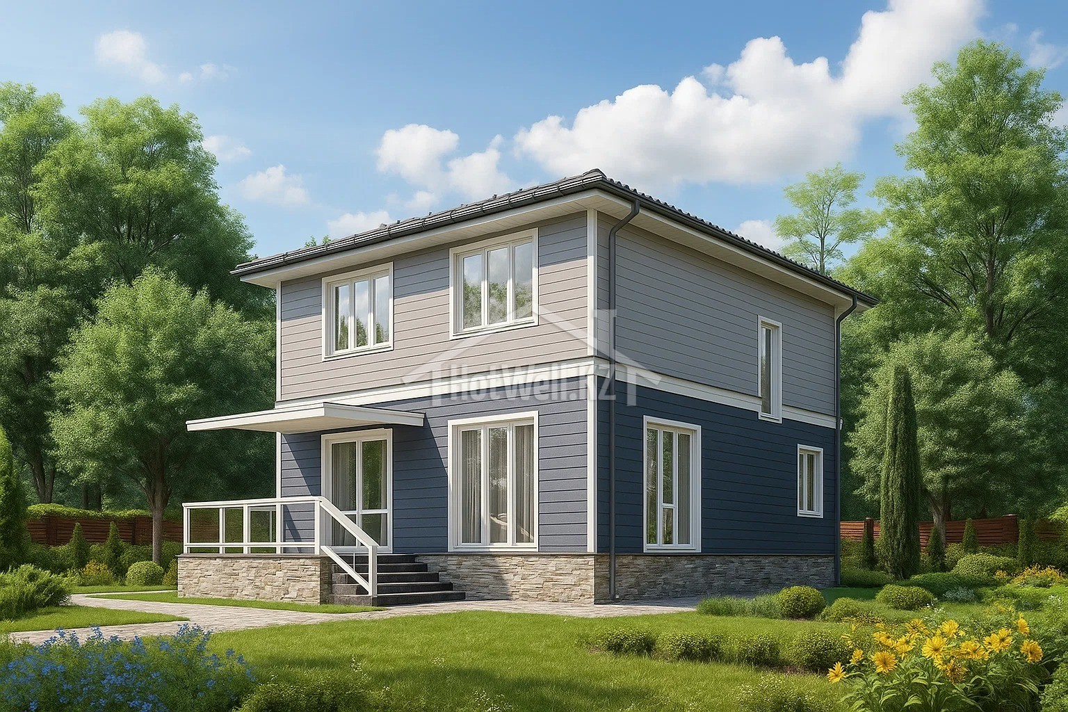 Двухэтажный дом 12 на 8 метров, общей площадью с террасой на 150 м2, из СИП панелей, с бойлерной, террасой и спальней на первом этаже.