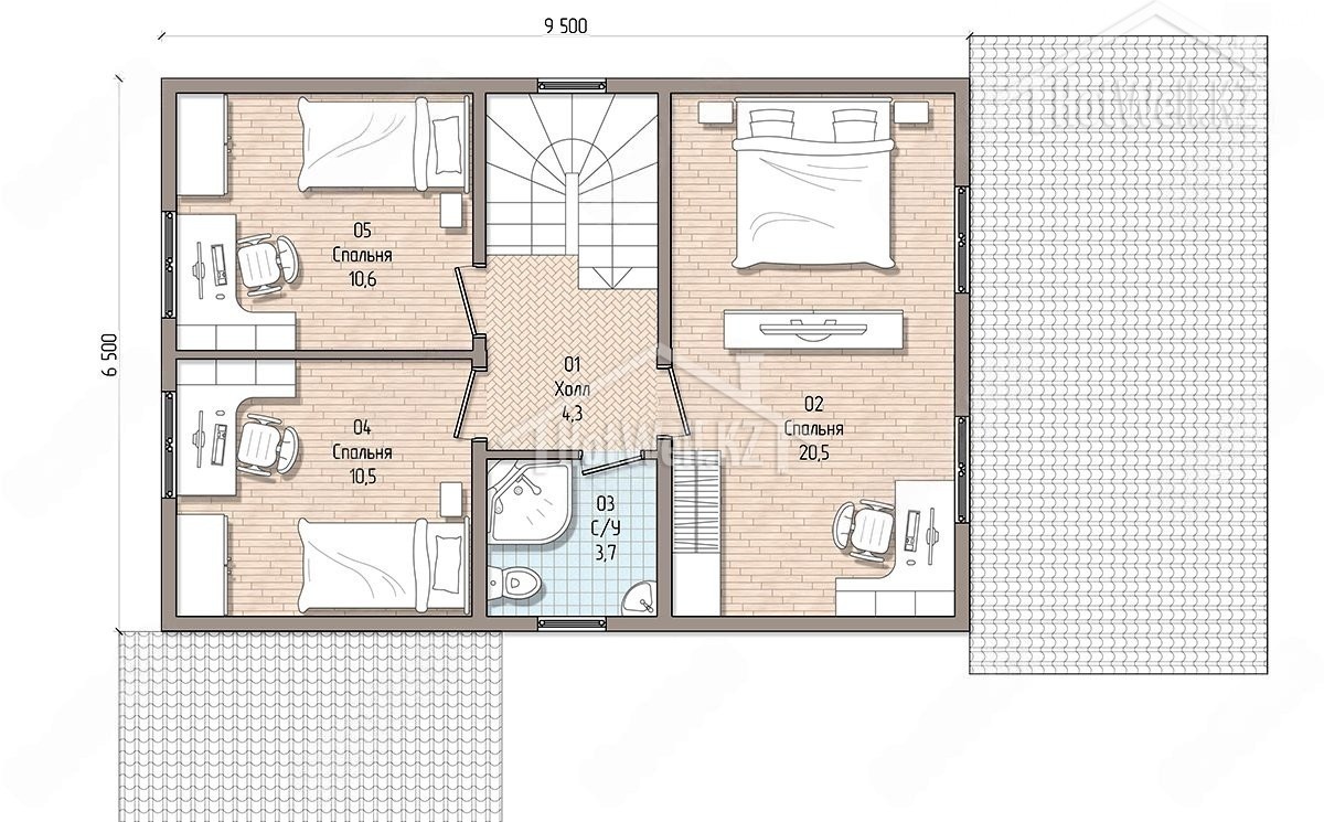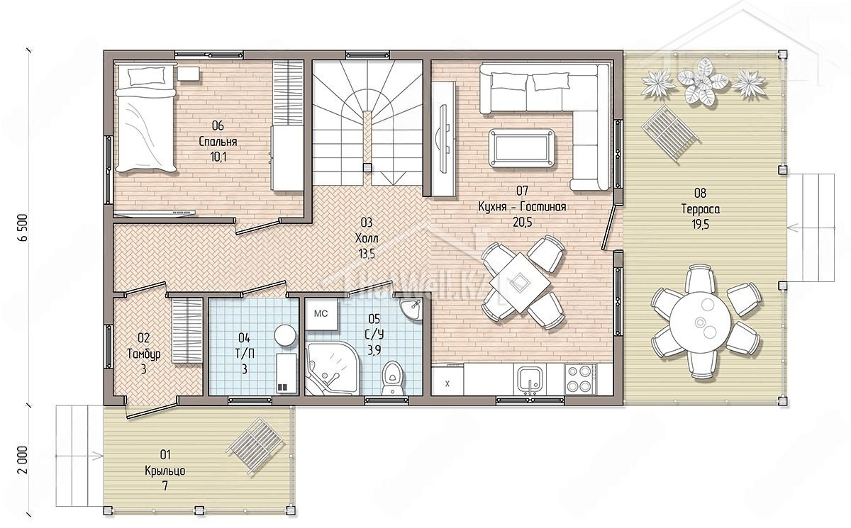 Дом с мансардой 9 на 13 метров, общей площадью 150 м2, из СИП панелей, с бойлерной, террасой и спальней на первом этаже.