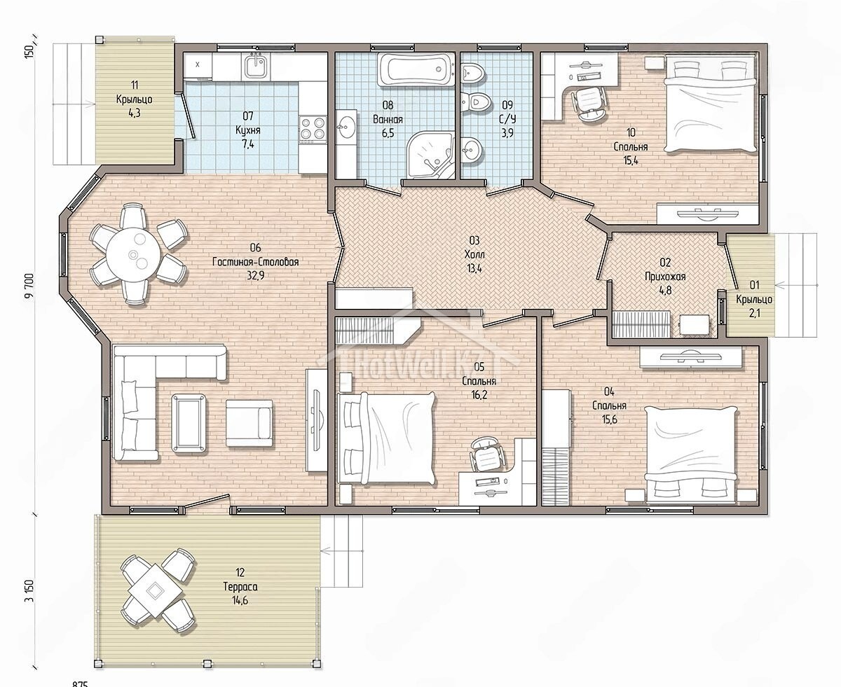 Внешние + внутренние несущие стены из СИП панелей Hotwell.KZ 158 мм (OSB-3 Толщина 9 мм, Пенополистирол ПСБ-С-20Ф)