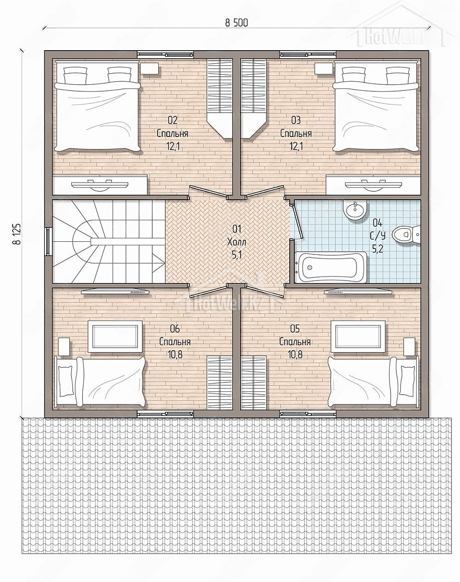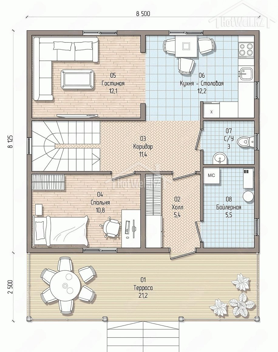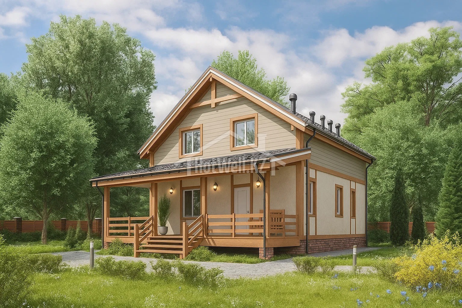 Дом с мансардой 11 на 9 метров, общей площадью 159 м2, из СИП панелей, с бойлерной, террасой и спальней на первом этаже.