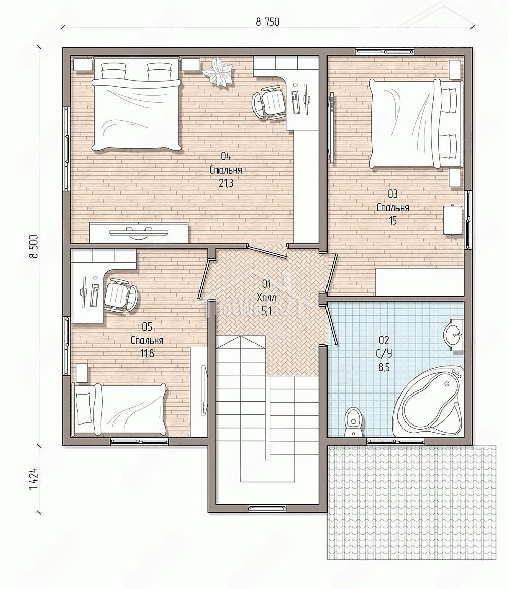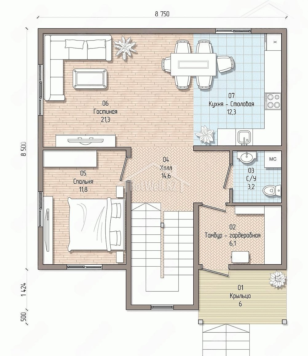 Данный проект дома основан на основе популярного проекта А-100, разница в том что у данного проекта вынесено за пределы дома тех помещение с тамбуром. Проект имеет большую гостинную на первом этаже 22 м2, отдельную кухню. Второй этаж имеет три спальни и сан узел. Тип крыши двускатная. Очень хороший и популярный проект.