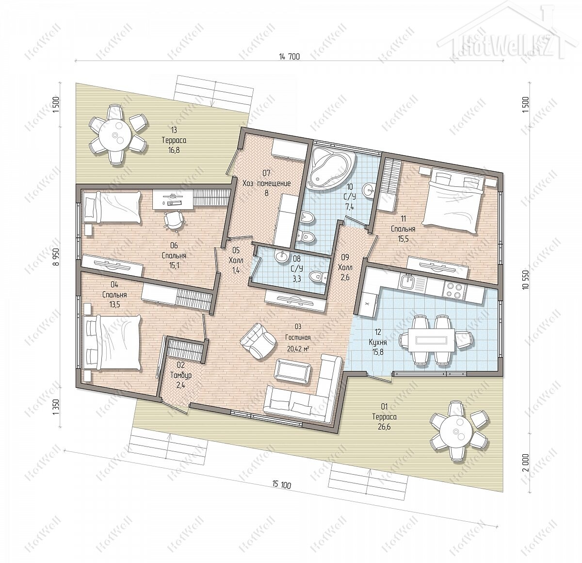 Одноэтажный дом 15 на 11 метров, общей площадью 162 м2, из СИП панелей, с террасой и спальней на первом этаже.