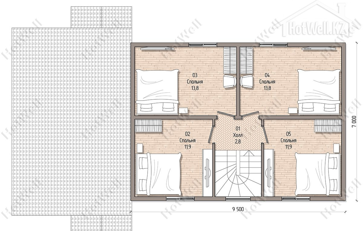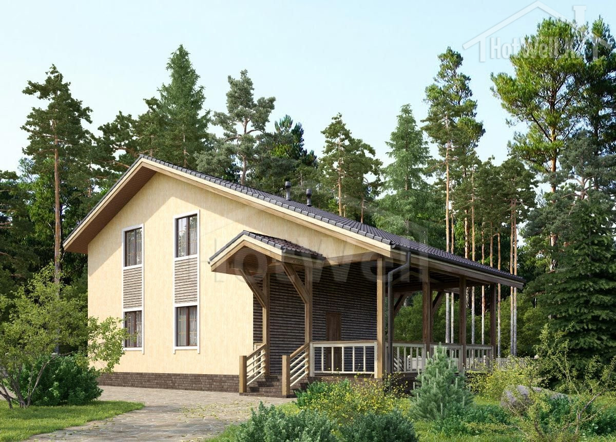 Данный проект дома основан на основе популярного проекта А-100, разница в том что у данного проекта вынесено за пределы дома тех помещение с тамбуром. Проект имеет большую гостинную на первом этаже 22 м2, отдельную кухню. Второй этаж имеет три спальни и сан узел. Тип крыши двускатная. Очень хороший и популярный проект.