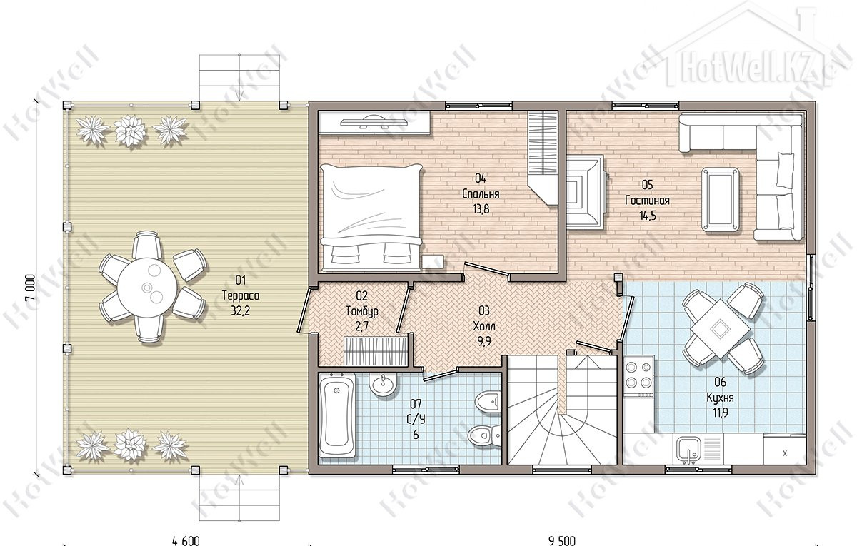 Дом с мансардой 14 на 7 метров, общей площадью 165 м2, из СИП панелей, с террасой и спальней на первом этаже.