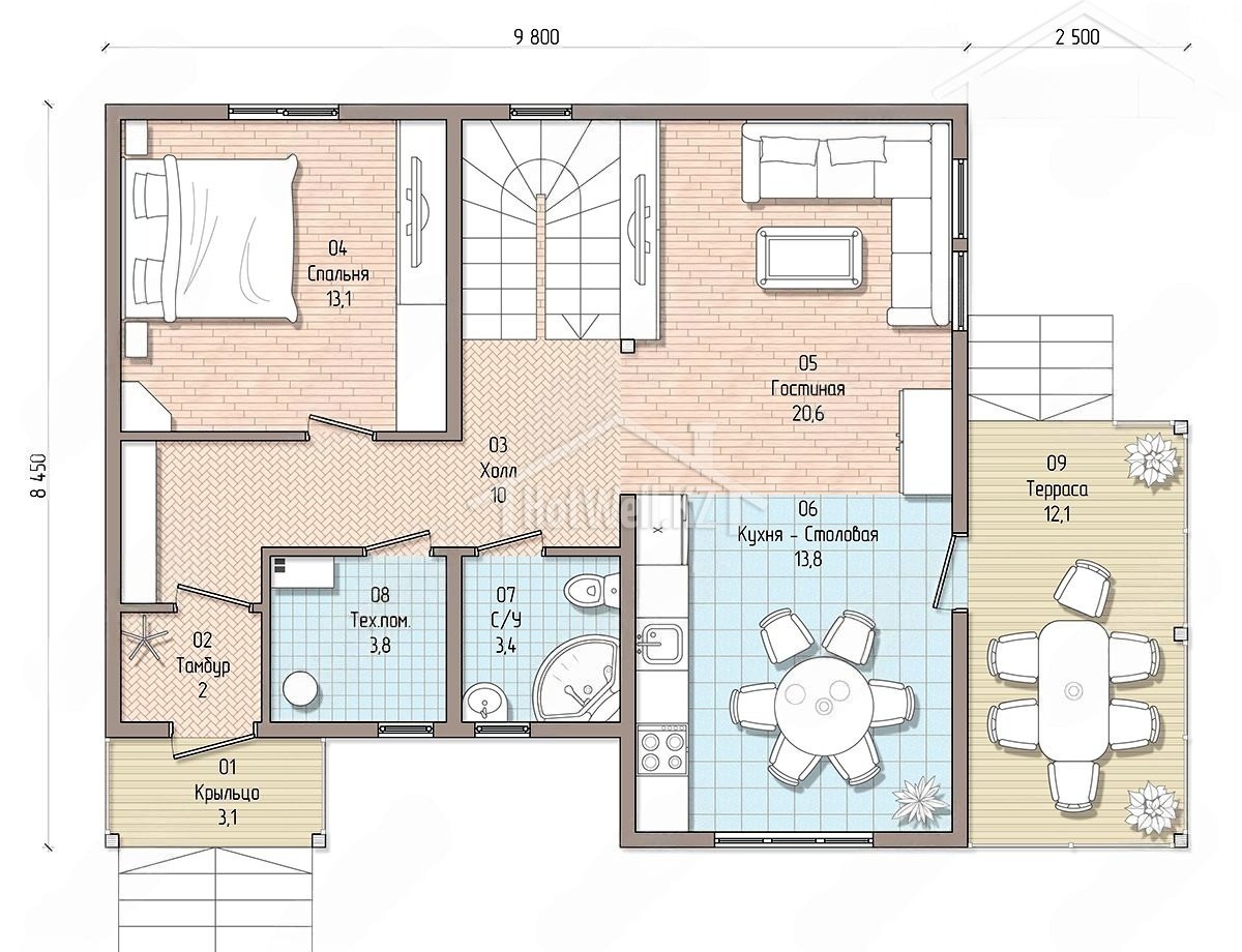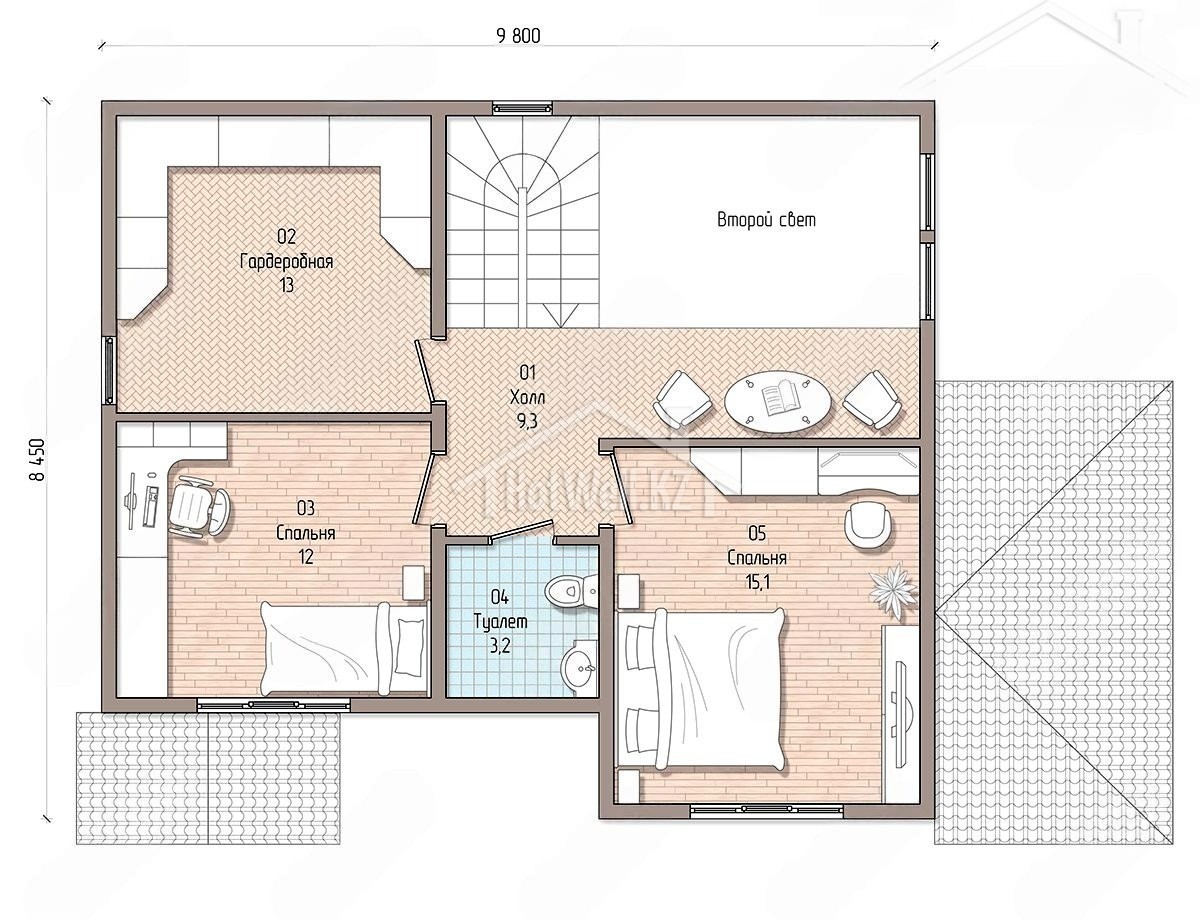 Двухэтажный дом 12 на 9 метров, общей площадью 166 м2, из СИП панелей, с бойлерной, террасой, вторым светом и спальней на первом этаже.