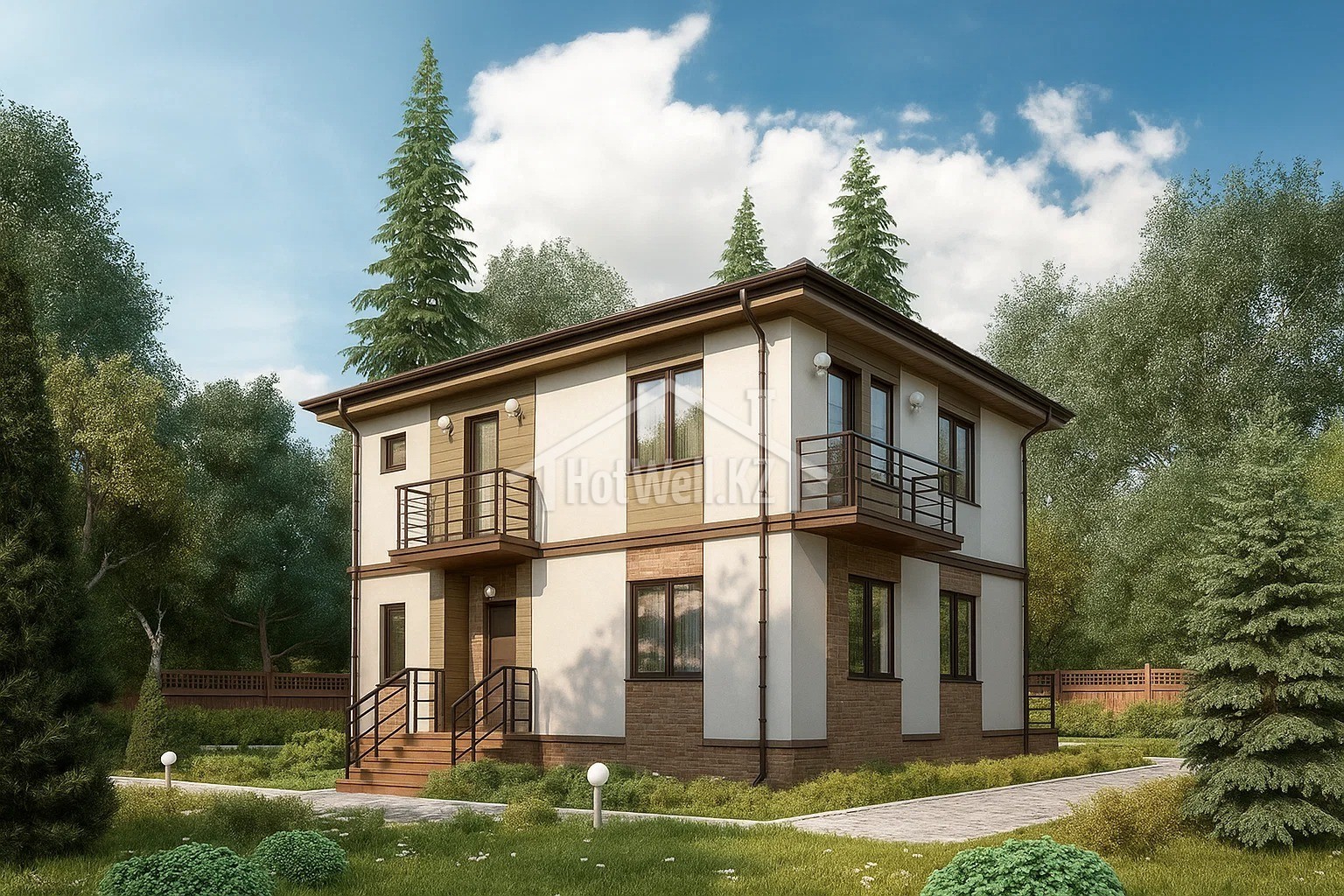 Двухэтажный дом 11 на 9 метров, общей площадью 167 м2, из СИП панелей, с бойлерной, террасой, балконом и спальней на первом этаже.