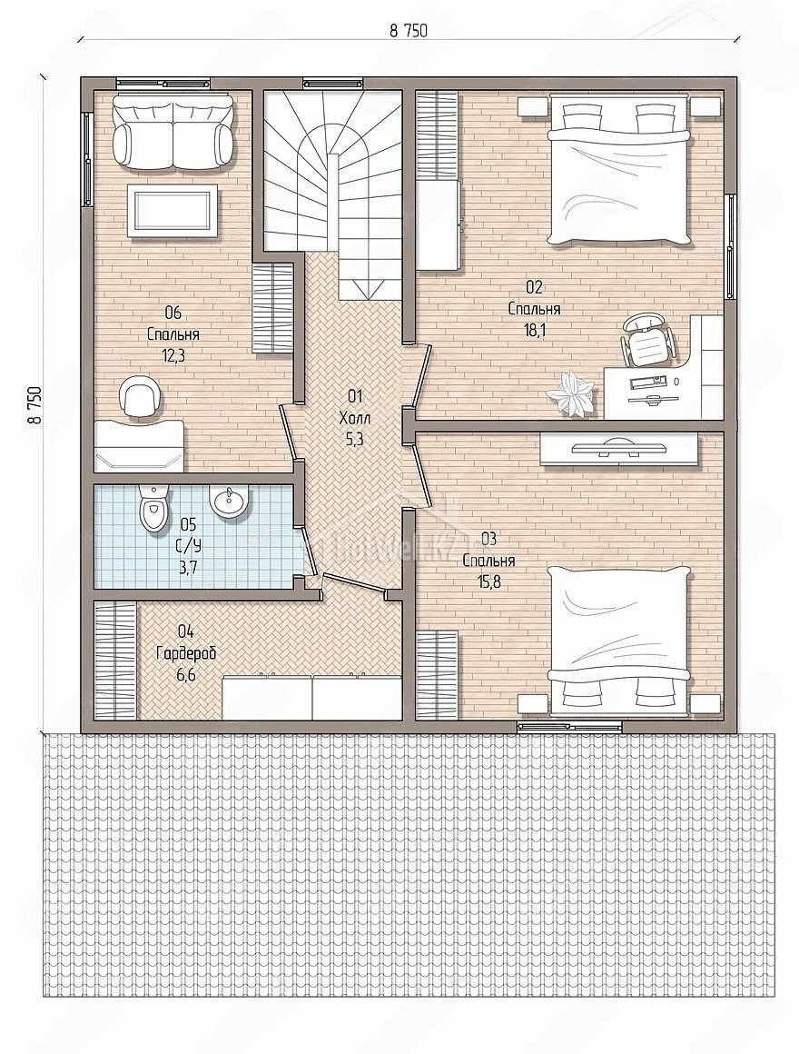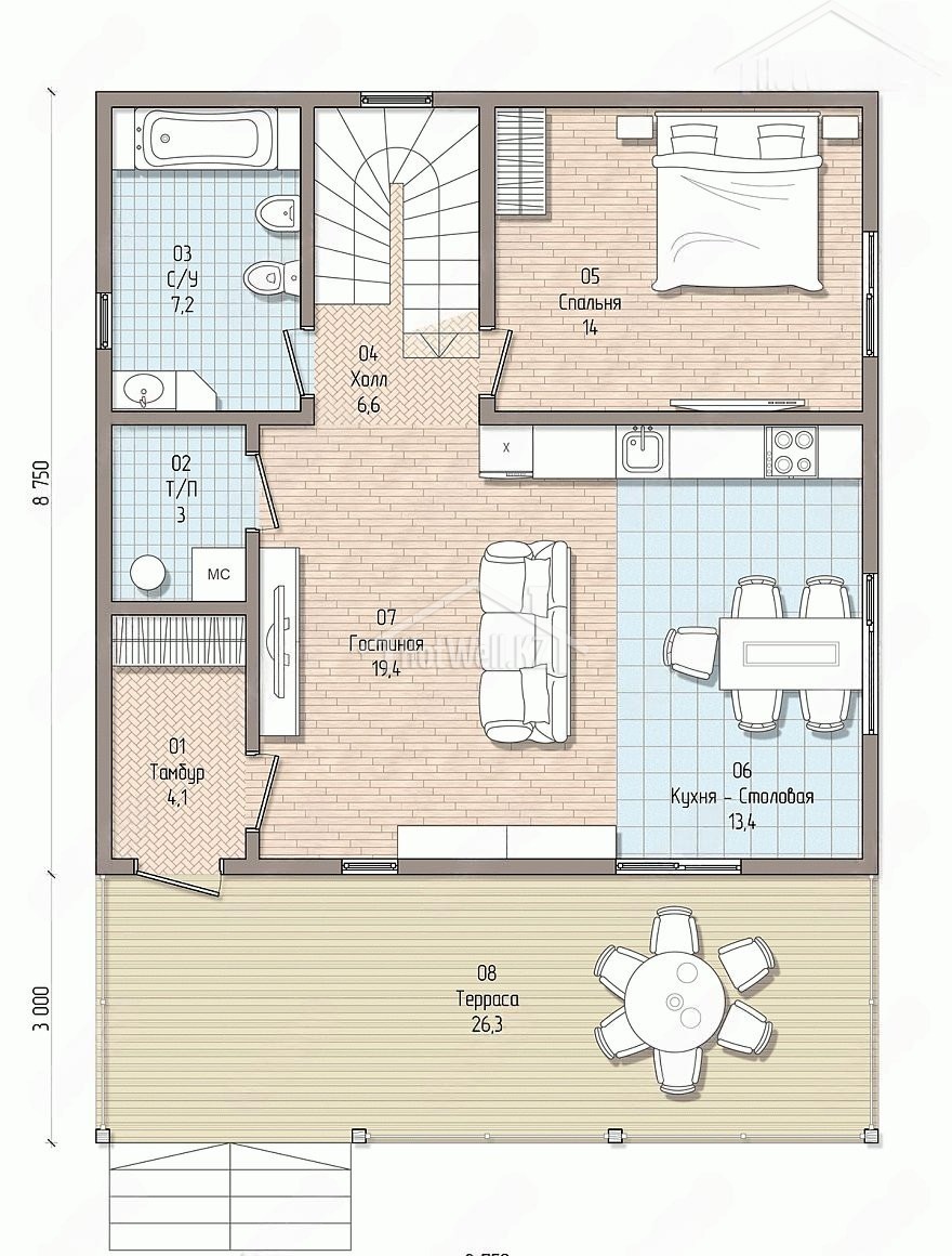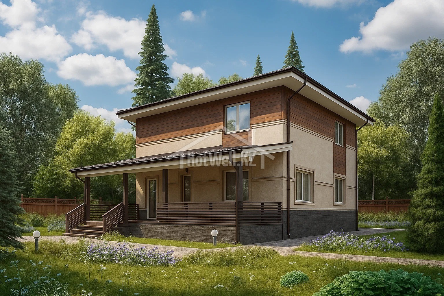 Двухэтажный дом 12 на 9 метров, общей площадью 178 м2, из СИП панелей, с бойлерной, террасой и спальней на первом этаже.
