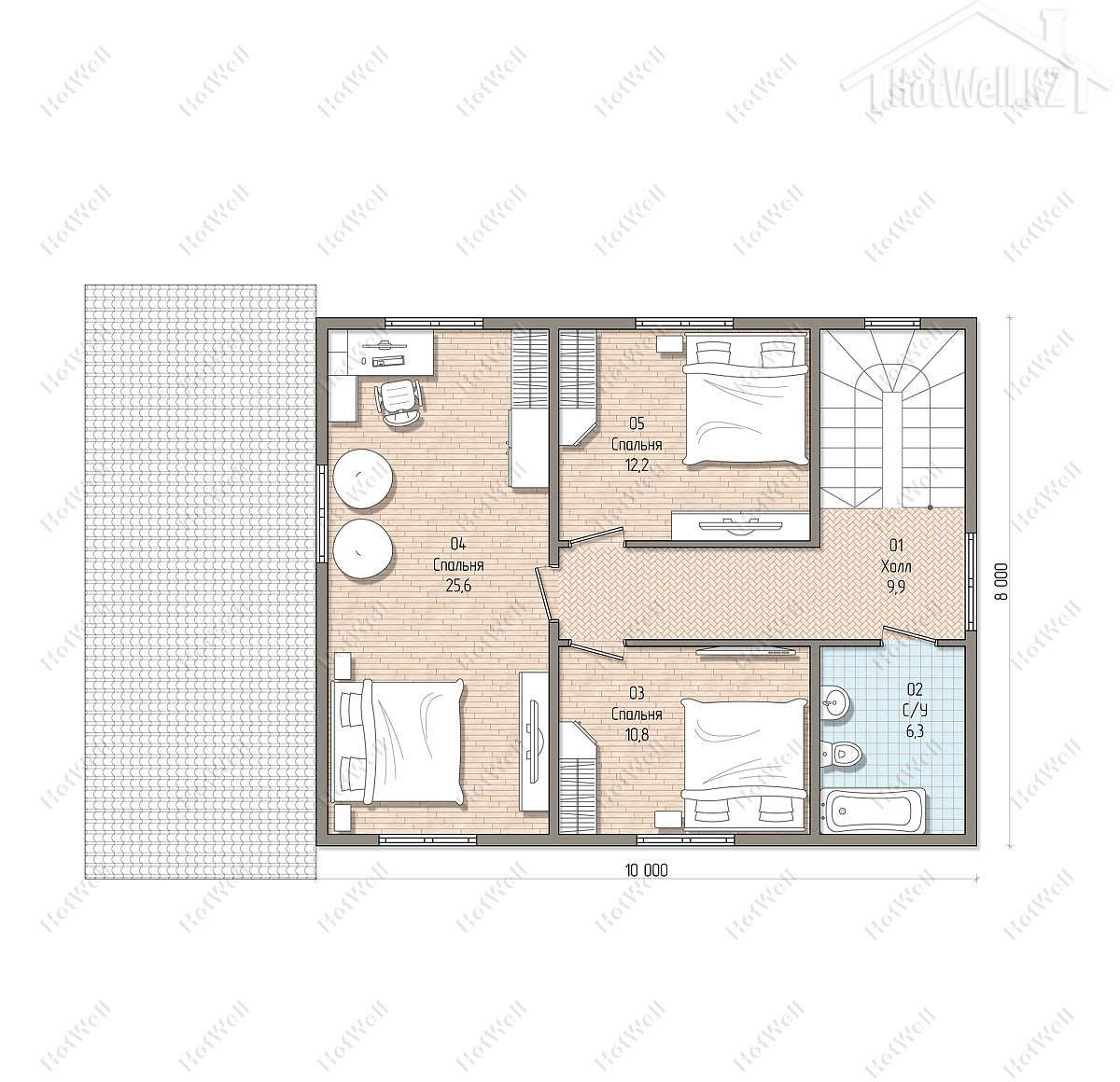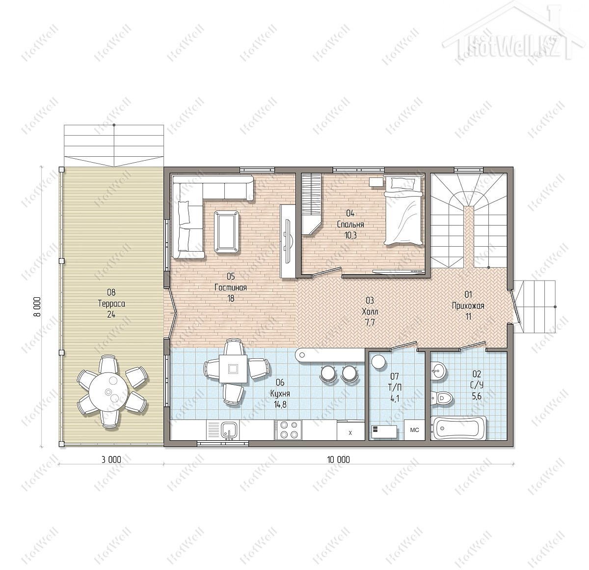 Двухэтажный дом общей площадью 184 м2, из СИП панелей, с бойлерной, террасой и спальней на первом этаже.
