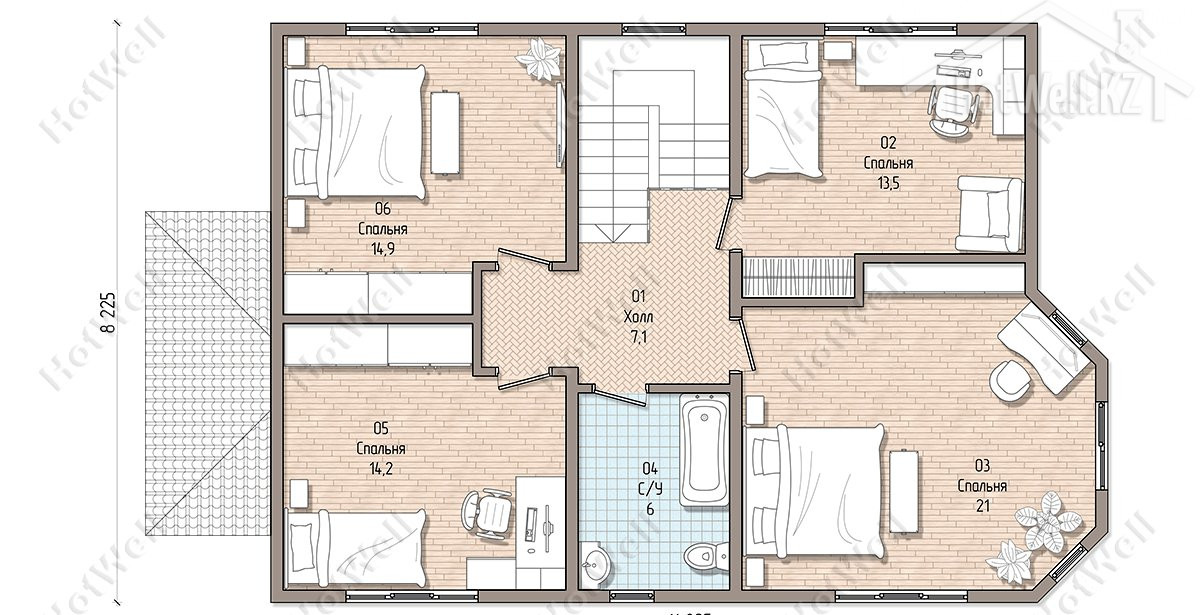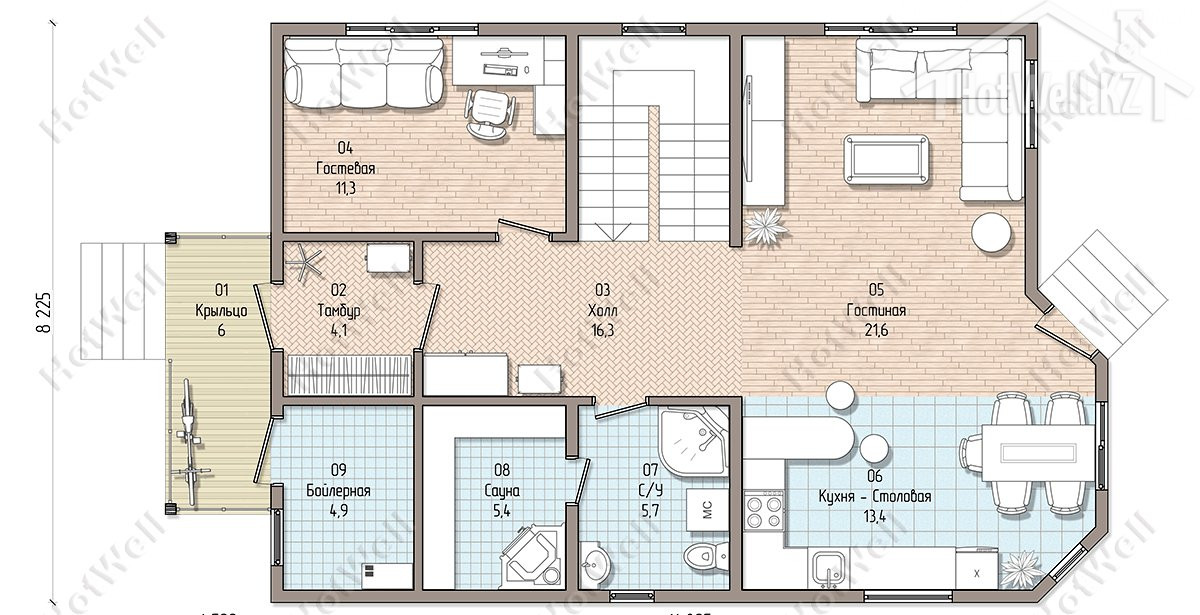 Двухэтажный дом 13 на 8 метров, общей площадью 192 м2, из СИП панелей, с сауной, бойлерной, эркером и спальней на первом этаже.