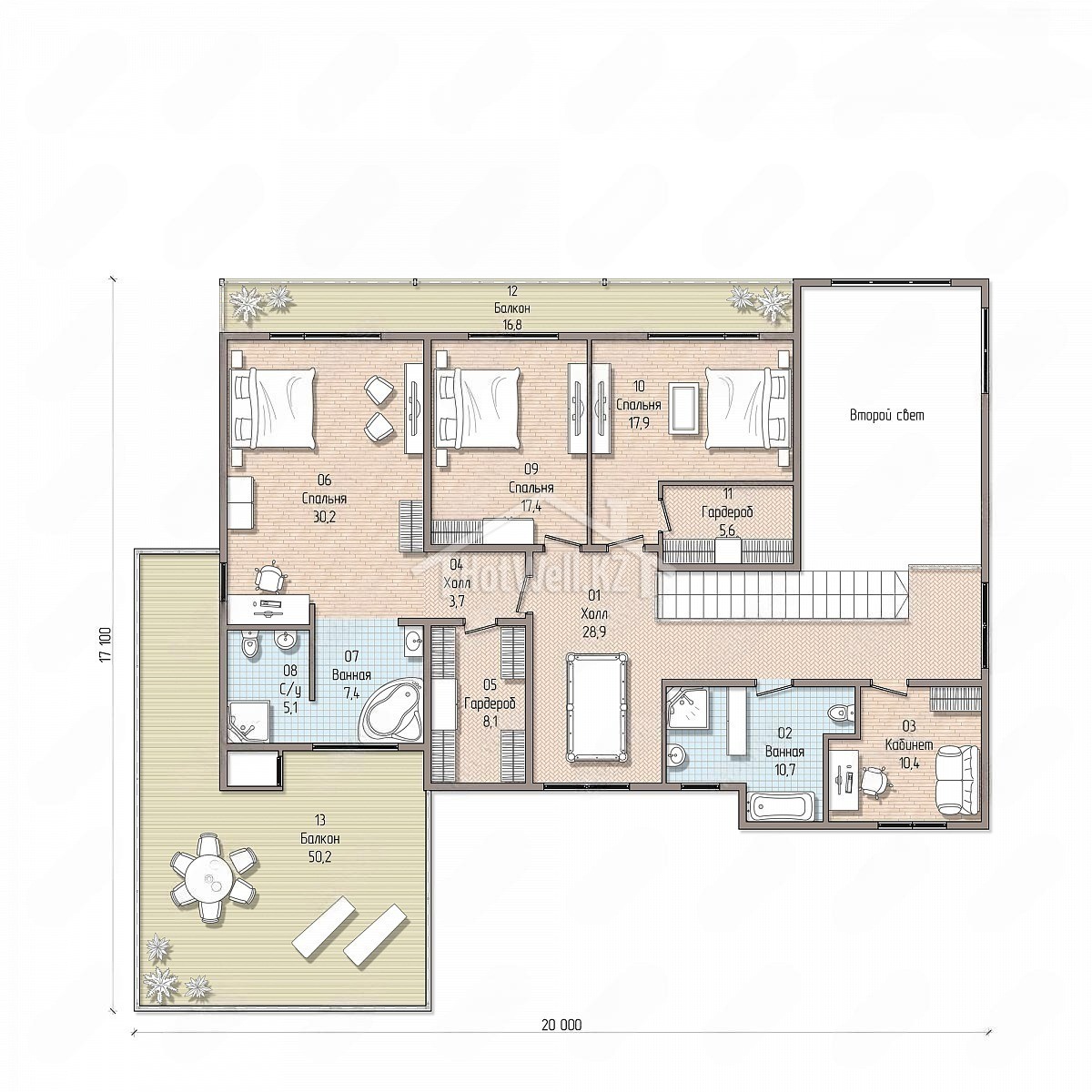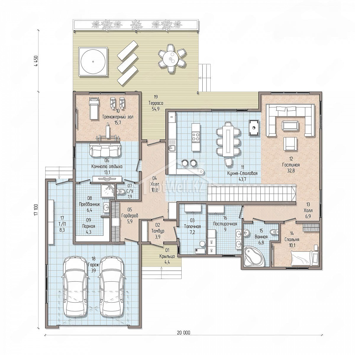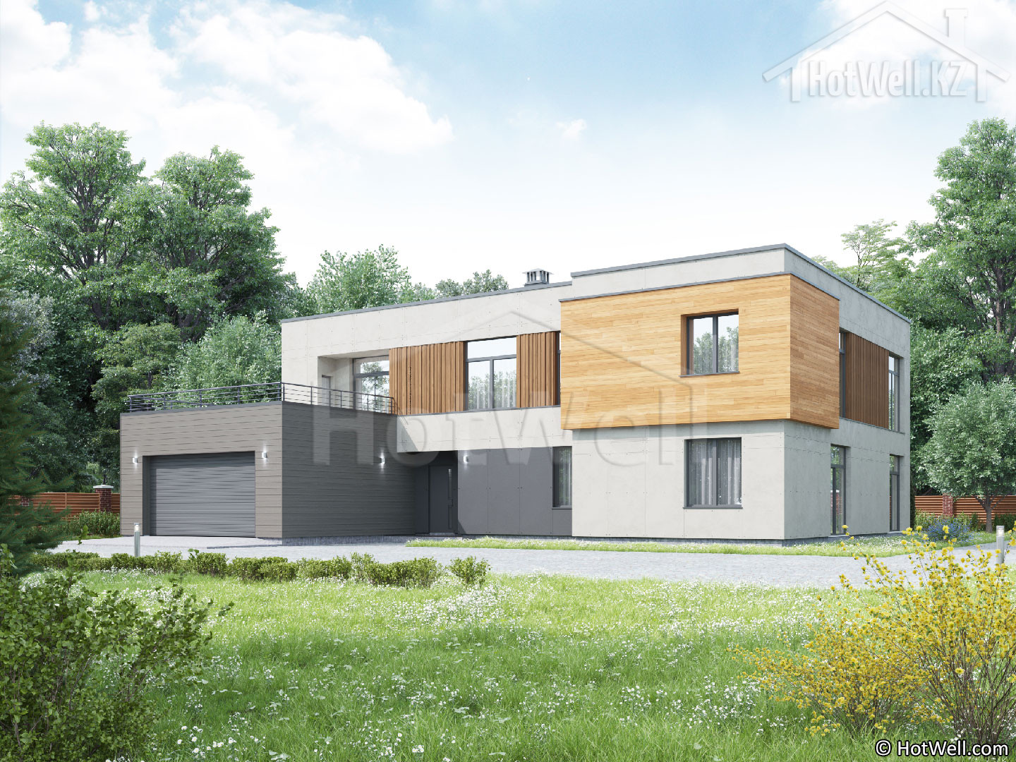 Двухэтажный дом 20 на 22 метров, общей площадью 577 м2, из СИП панелей, с сауной, бойлерной, гаражом, террасой, балконом, вторым светом и спальней на первом этаже.