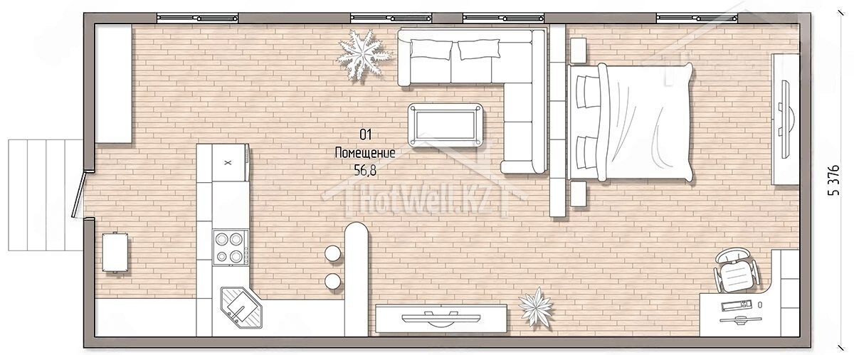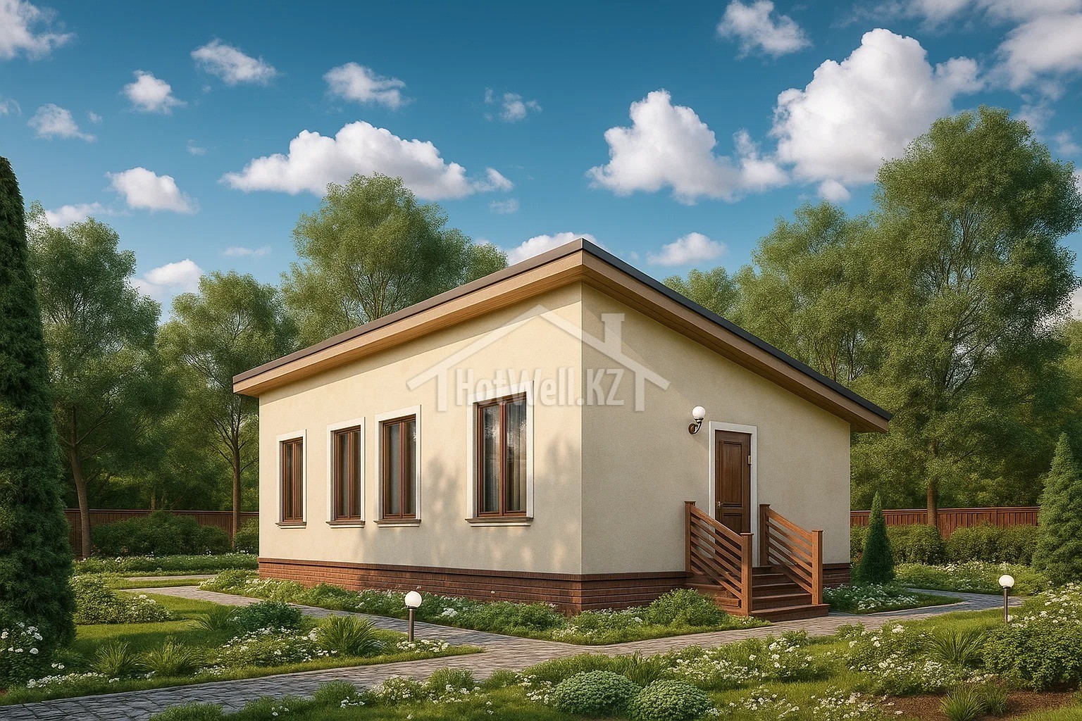 Одноэтажный дом 12 на 5 метров, общей площадью 63 м2, из СИП панелей.