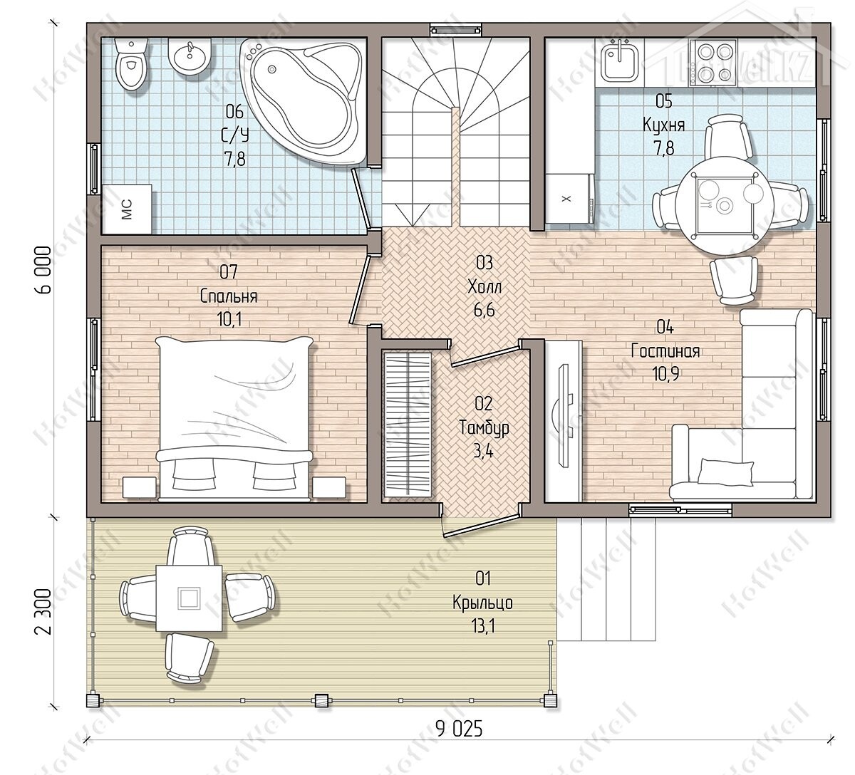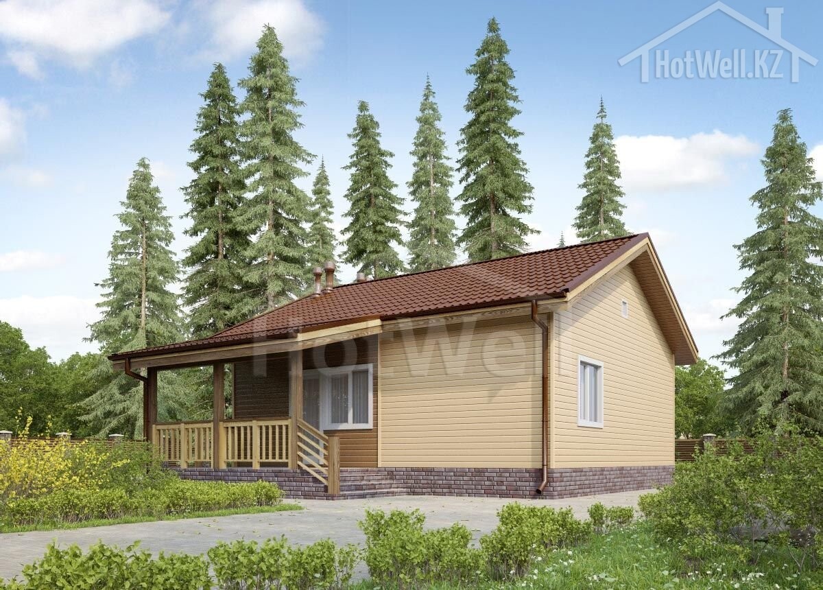 Дом с мансардой 9 на 8 метров, общей площадью 67 м2, из СИП панелей, с террасой и спальней на первом этаже.