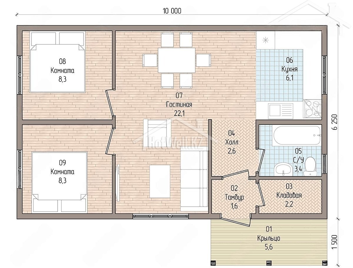 Одноэтажный дом 10 на 8 метров, общей площадью 68 м2, из СИП панелей, с террасой и спальней на первом этаже.
