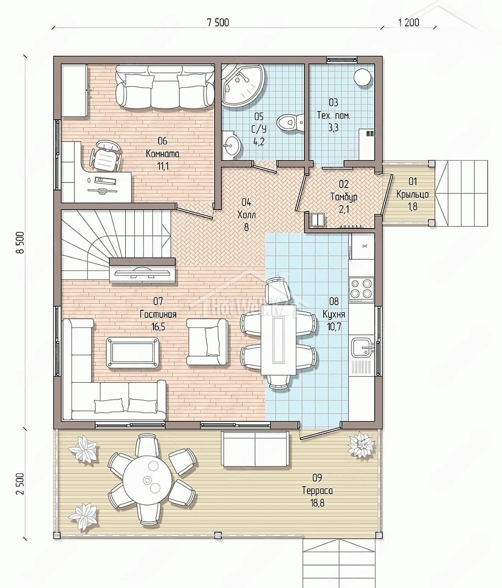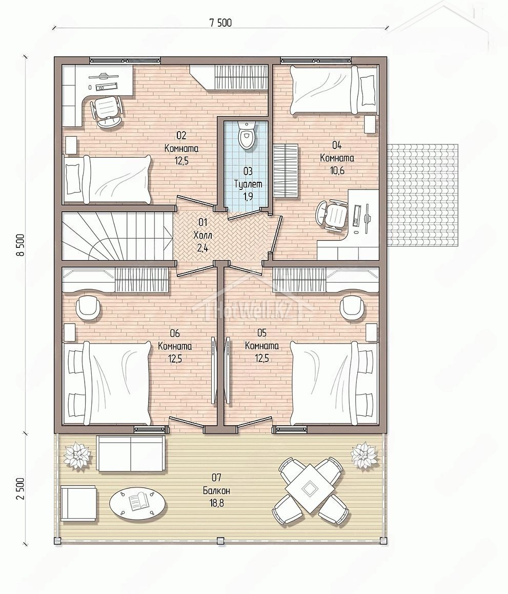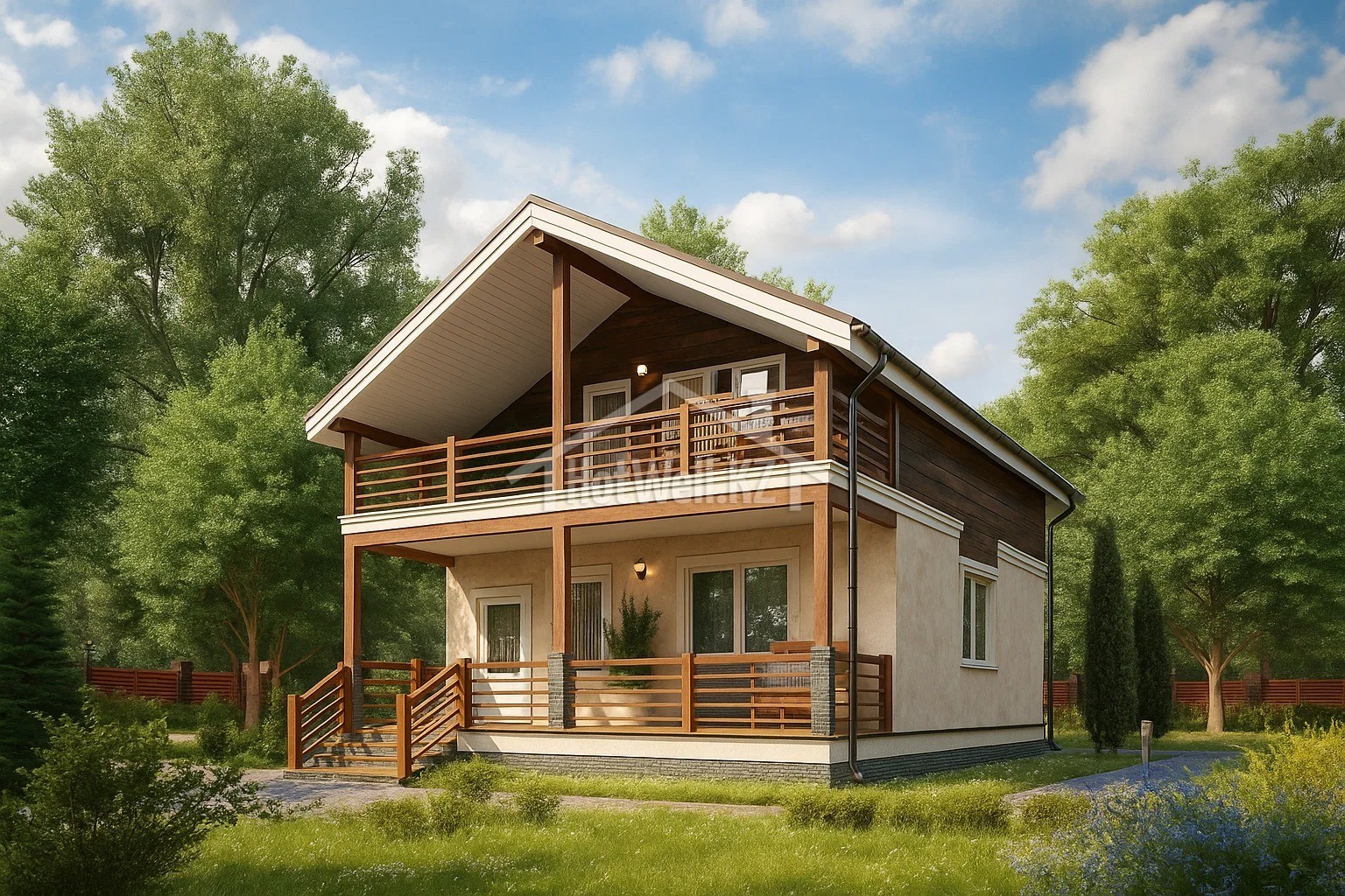 Дом с мансардой 11 на 9 метров, общей площадью 166 м2, из СИП панелей, с бойлерной, террасой, балконом и спальней на первом этаже.