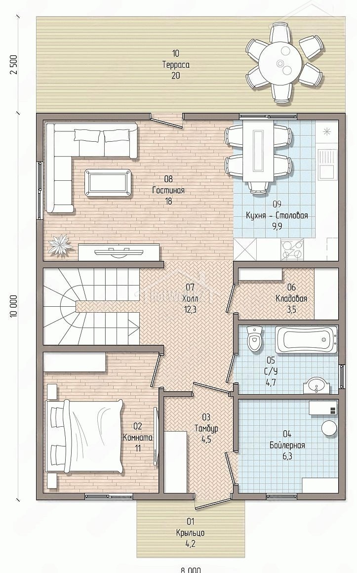 Двухэтажный дом 14 на 8 метров, общей площадью 184 м2, из СИП панелей, с бойлерной, террасой и спальней на первом этаже.