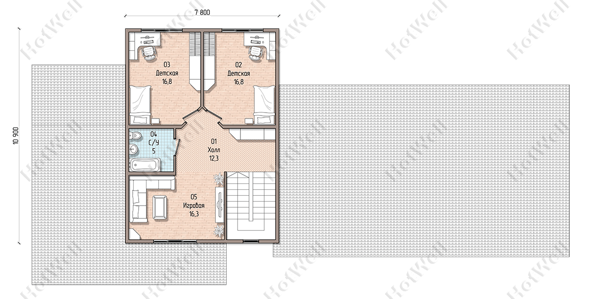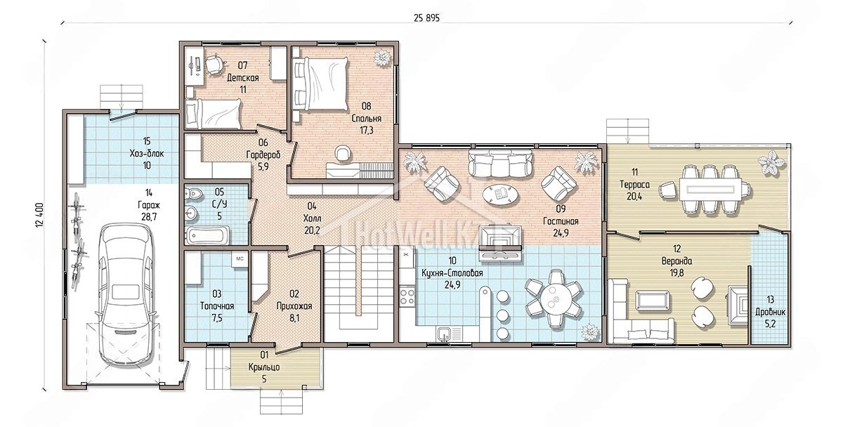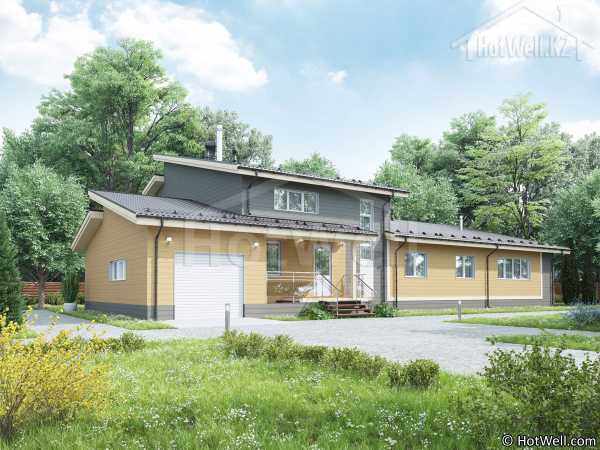 Дом с мансардой 26 на 12 метров, общей площадью 318 м2, из СИП панелей, с бойлерной, гаражом, террасой и спальней на первом этаже.