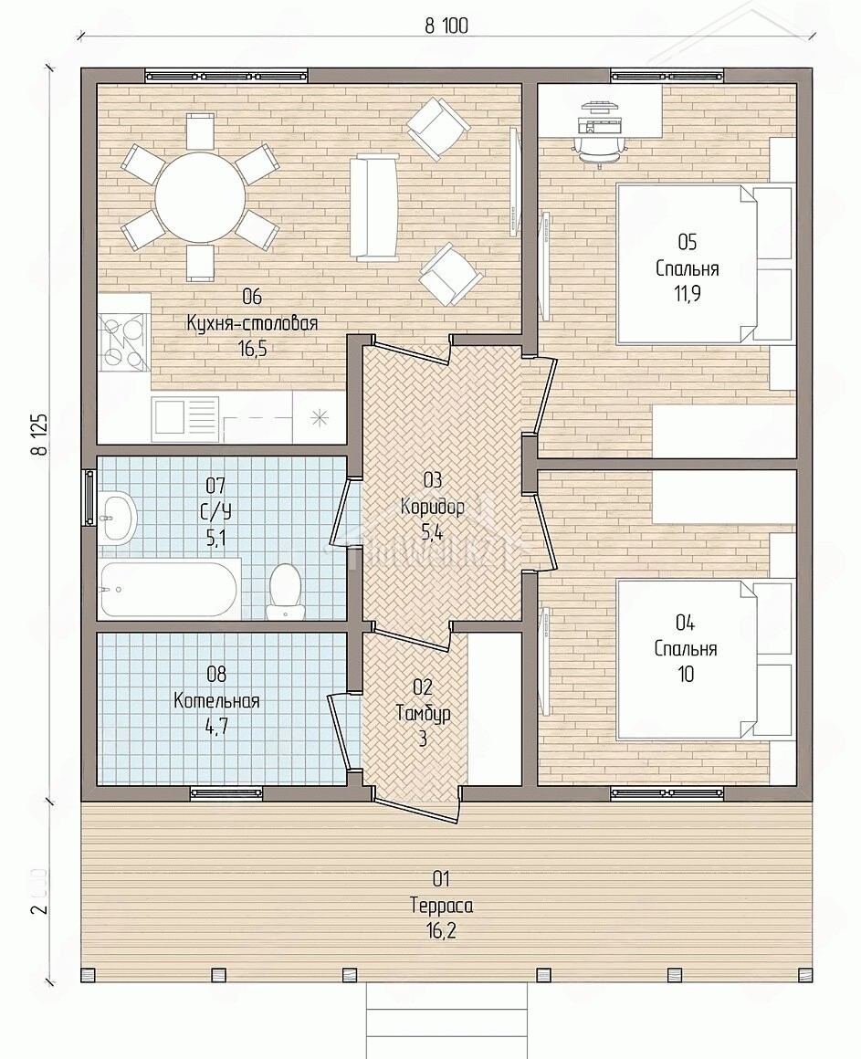 Одноэтажный дом 10 на 8 метров, общей площадью 82 м2, из СИП панелей, с бойлерной, террасой и спальней на первом этаже.