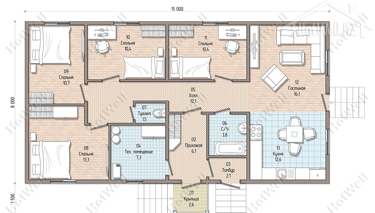 Одноэтажный дом 15 на 10 метров, общей площадью 122 м2, из СИП панелей, с бойлерной и спальней на первом этаже.