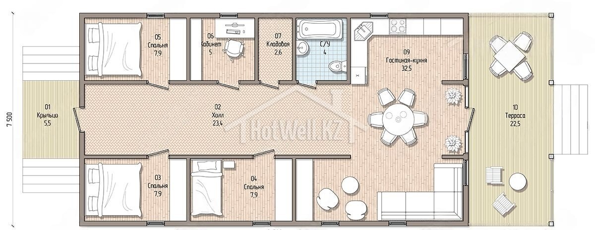 Одноэтажный дом 19 на 8 метров, общей площадью 131 м2, из СИП панелей, с террасой и спальней на первом этаже.