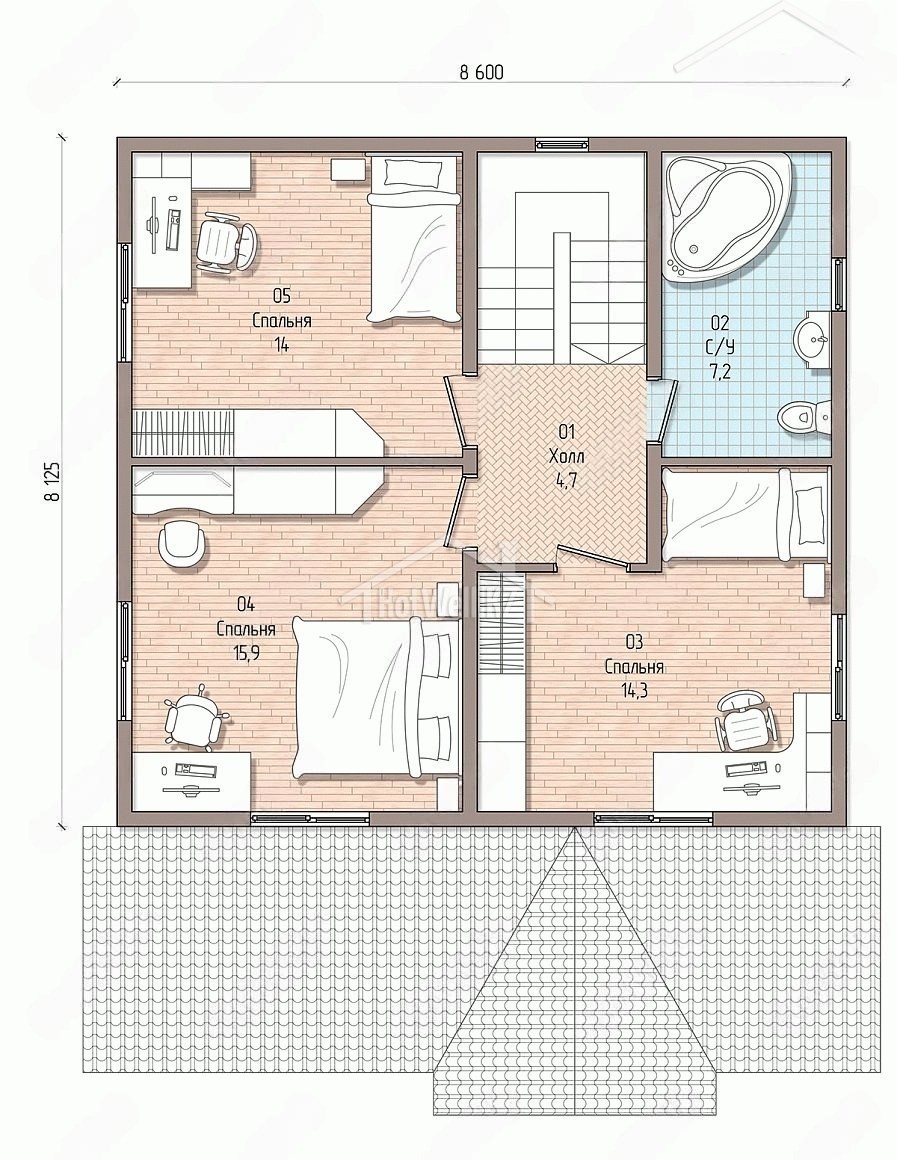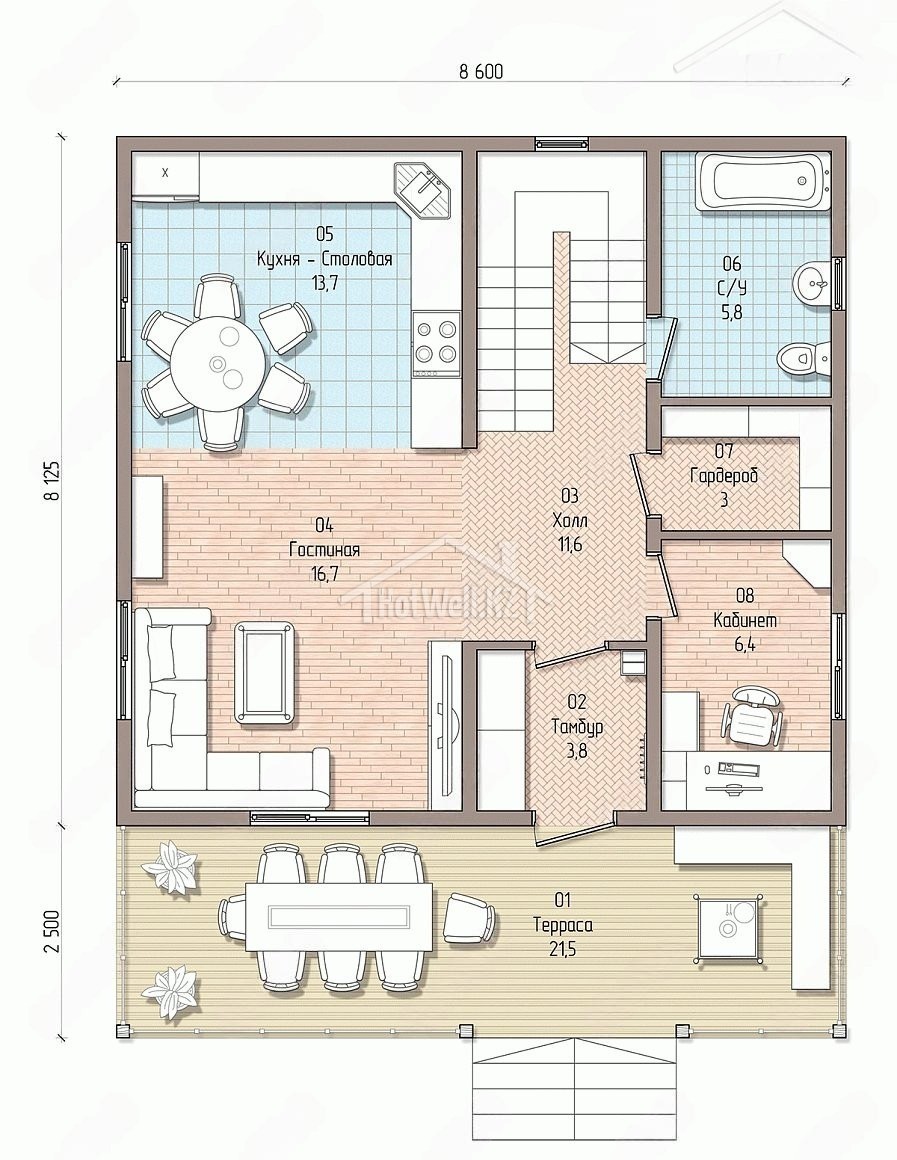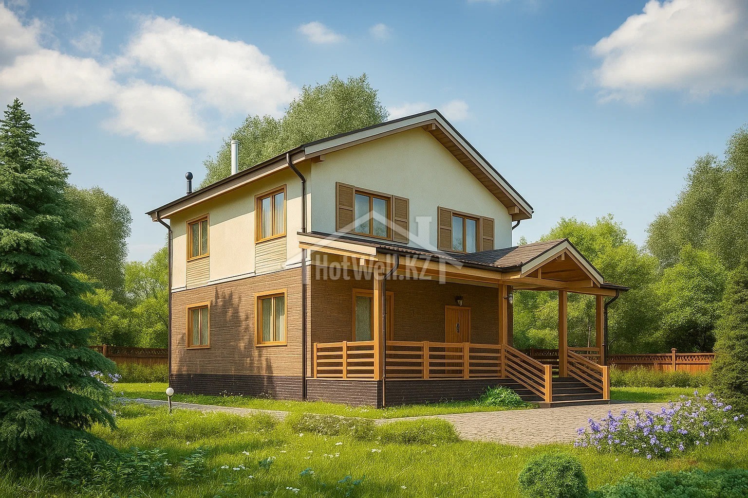 Двухэтажный дом 11 на 9 метров, общей площадью 161 м2, из СИП панелей, с террасой и спальней на первом этаже.
