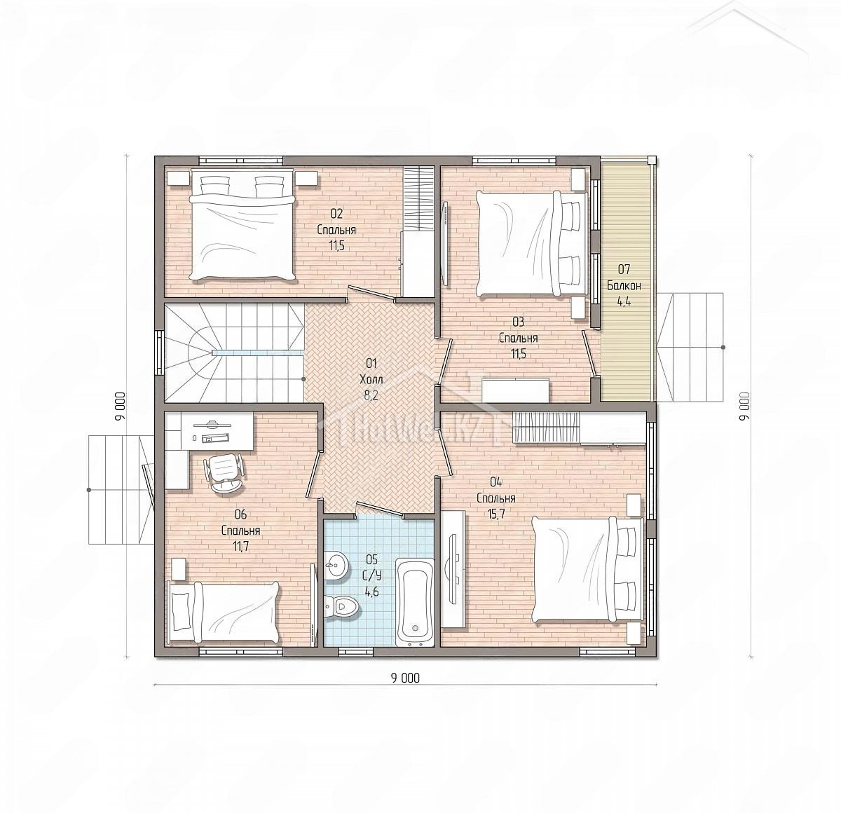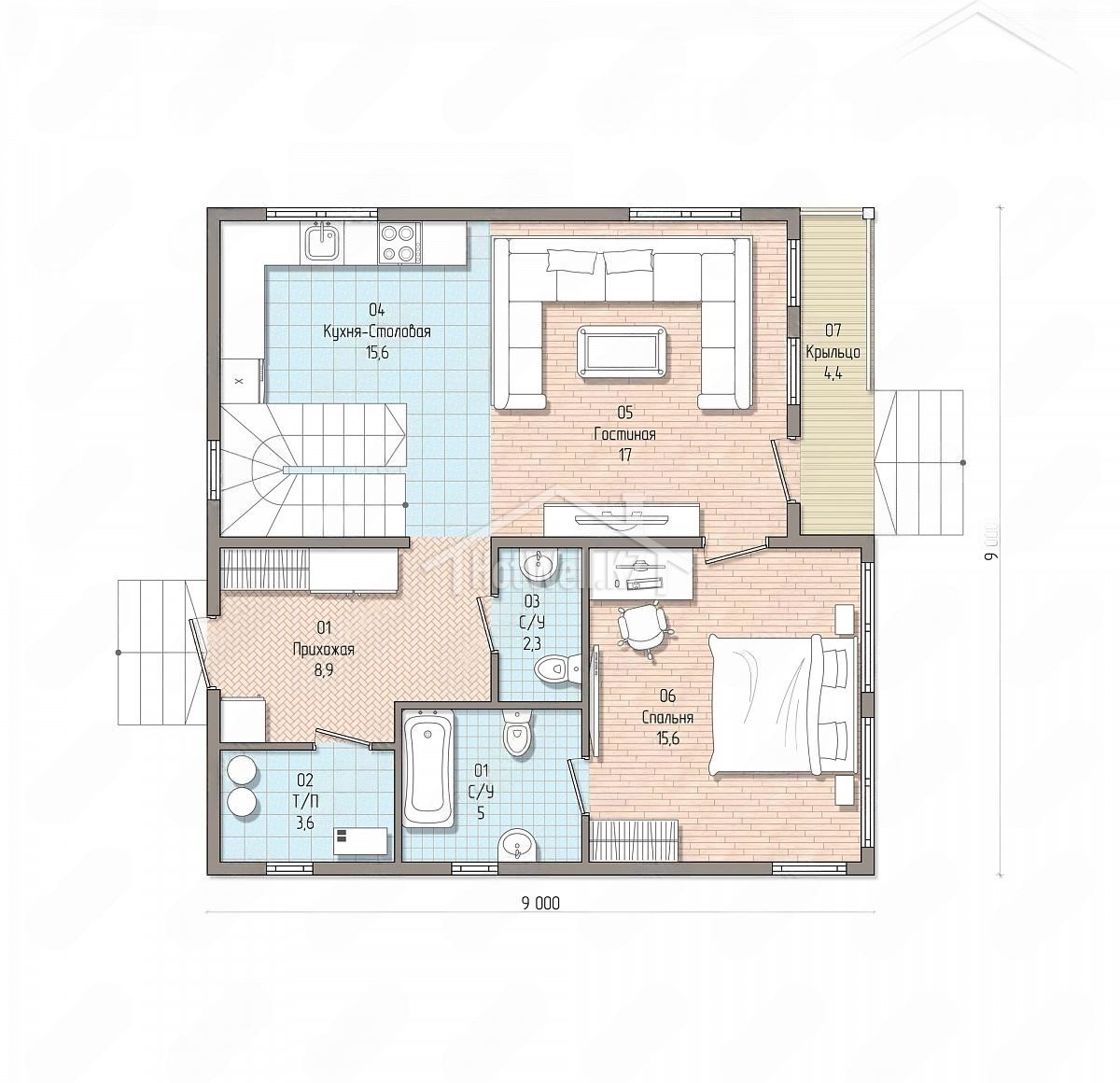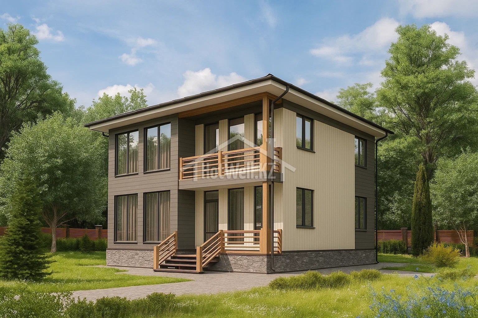 Двухэтажный дом 9 на 9 метров, общей площадью 162 м2, из СИП панелей, с бойлерной, балконом и спальней на первом этаже.