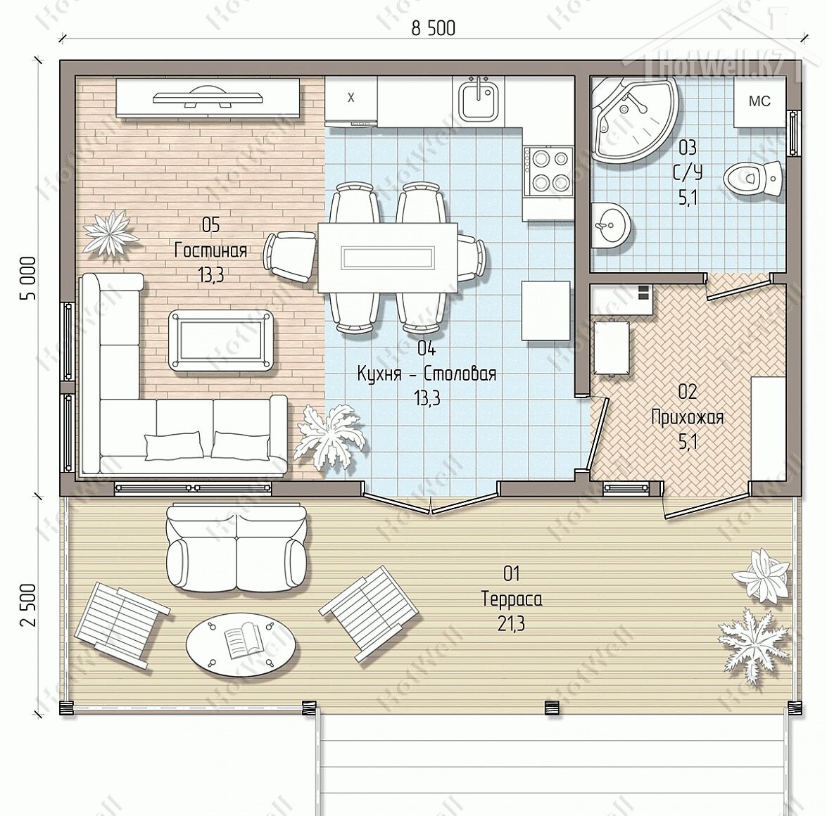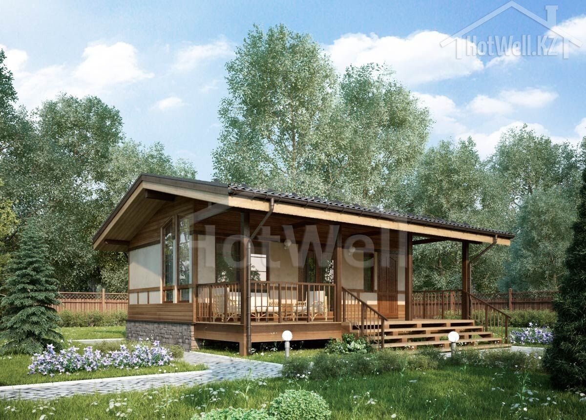 Одноэтажный дом 9 на 8 метров, общей площадью 63.75 м2, из СИП панелей, с террасой.