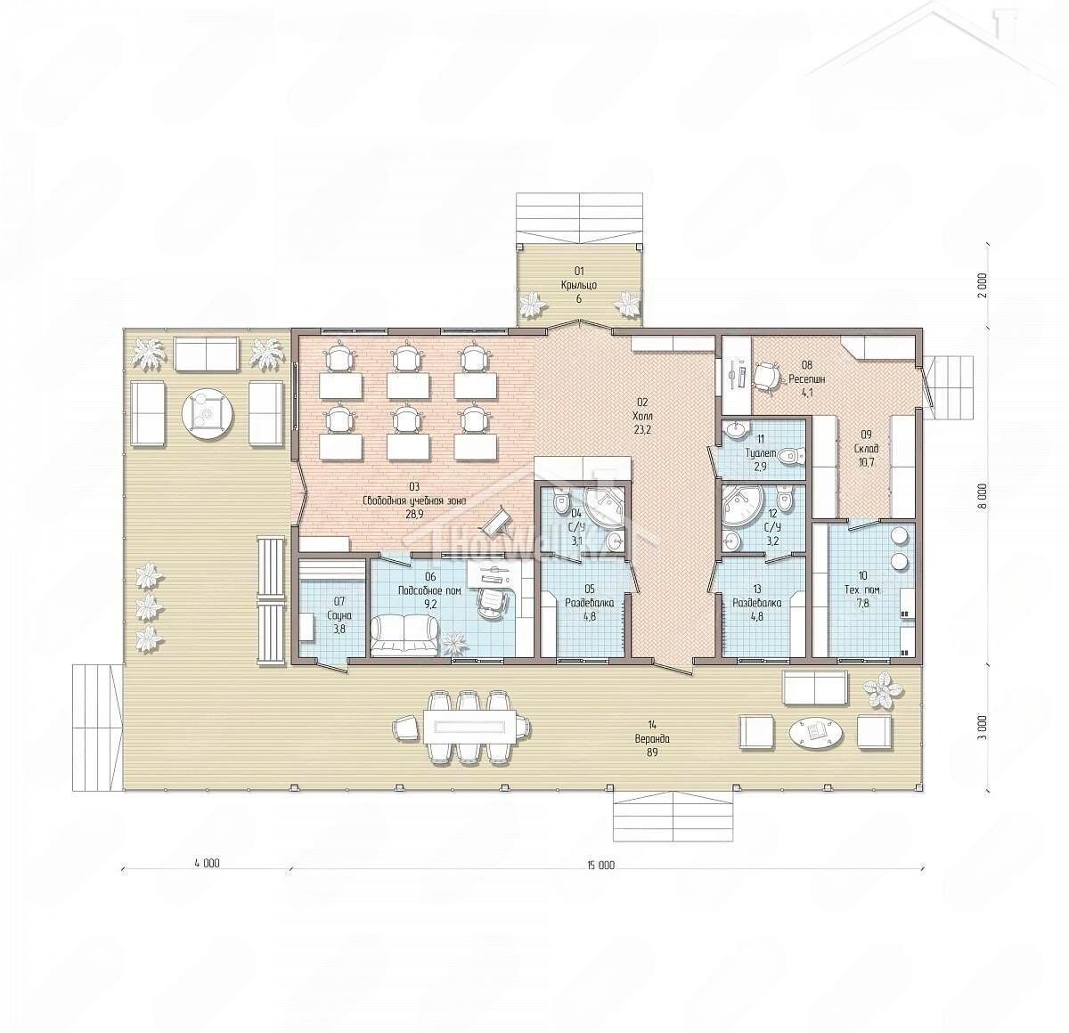 Одноэтажный дом 19 на 13 метров, общей площадью 215 м2, из СИП панелей, с сауной, бойлерной и террасой.