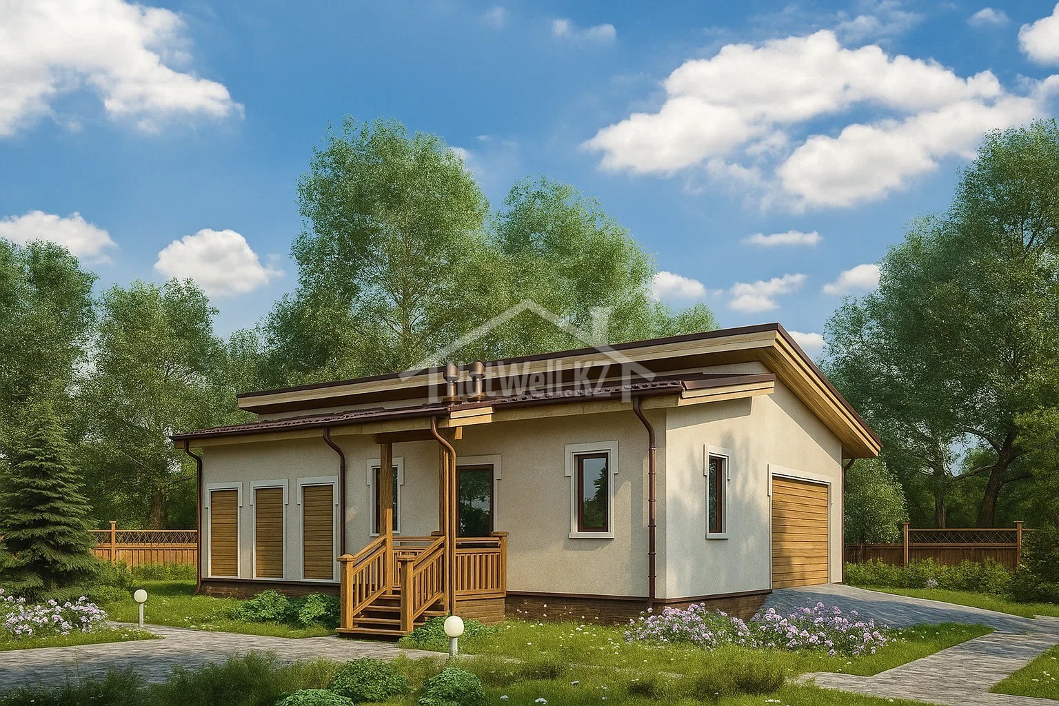 Одноэтажный дом 9 на 13 метров, общей площадью 102 м2, из СИП панелей, с гаражом и спальней на первом этаже.