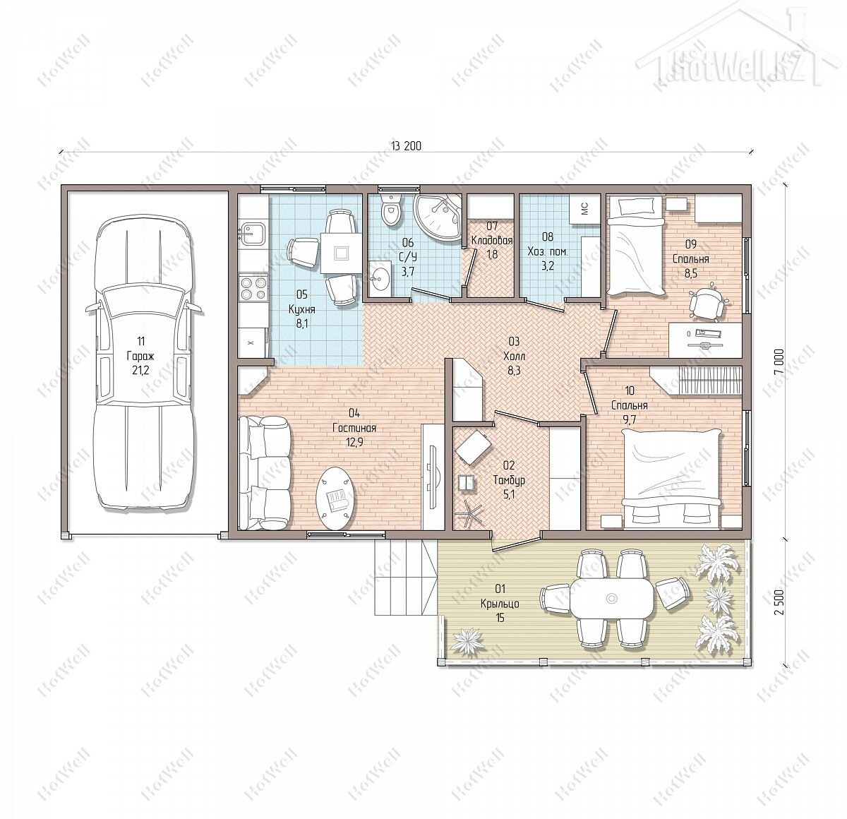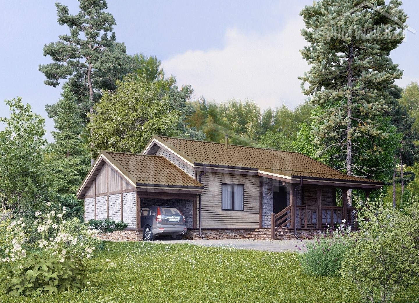 Одноэтажный дом 13 на 10 метров, общей площадью 107 м2, из СИП панелей, с бойлерной, гаражом, террасой и спальней на первом этаже.