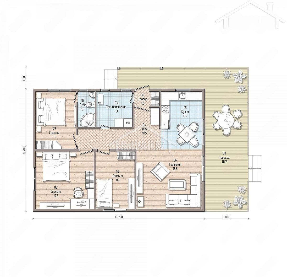 Одноэтажный дом 15 на 10 метров, общей площадью 137 м2, из СИП панелей, с бойлерной, террасой и спальней на первом этаже.