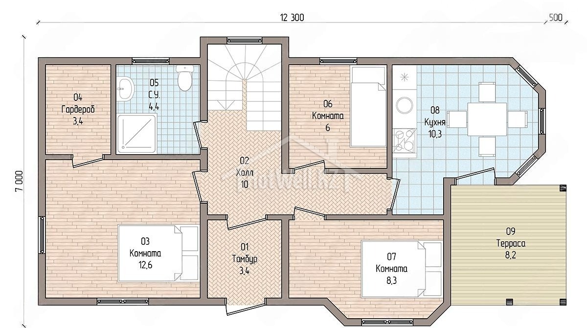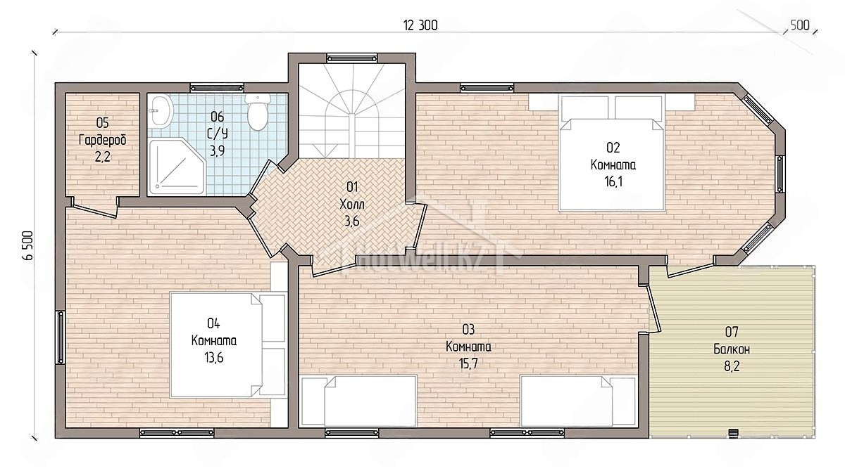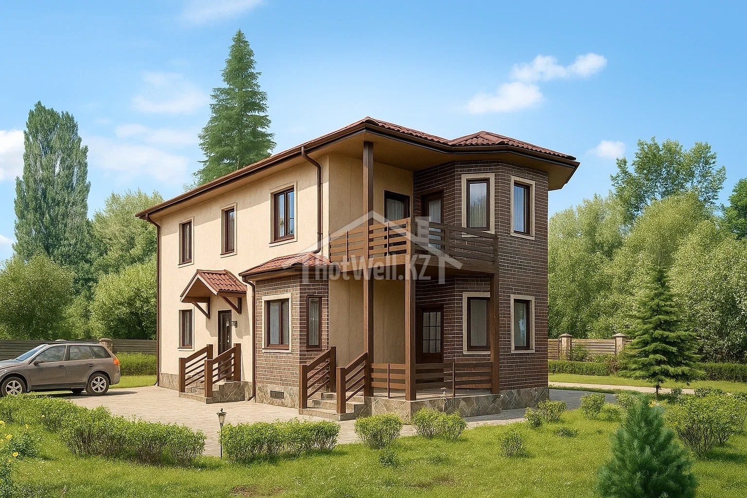 Двухэтажный дом 13 на 7 метров, общей площадью 153 м2, из СИП панелей, с террасой, балконом, эркером и спальней на первом этаже.