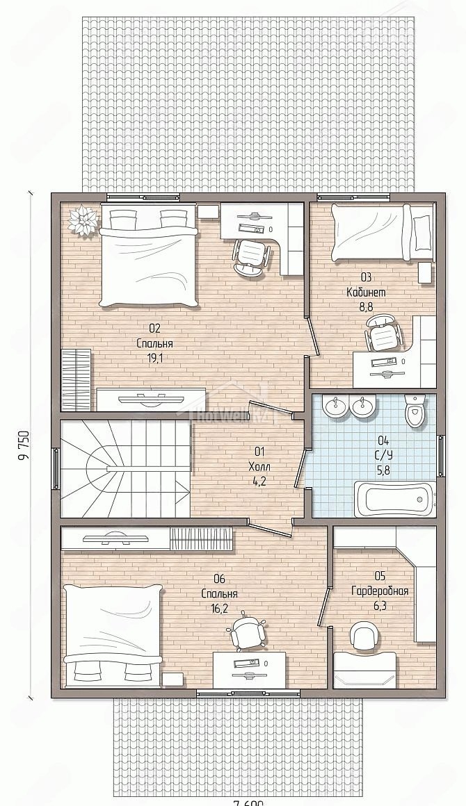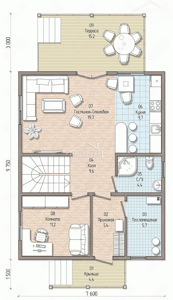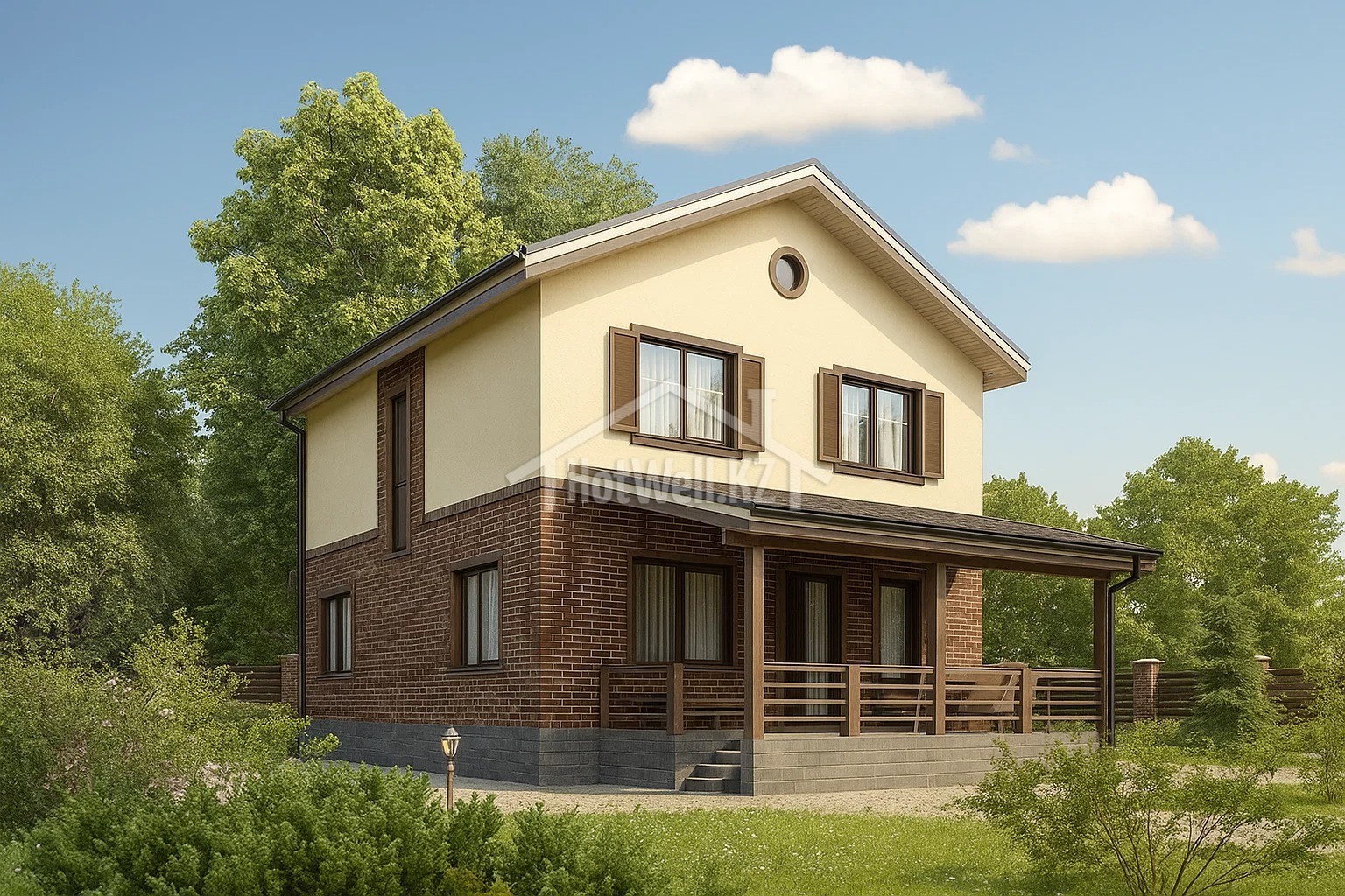 Двухэтажный дом 14 на 8 метров, общей площадью 171 м2, из СИП панелей, с бойлерной, террасой и спальней на первом этаже.