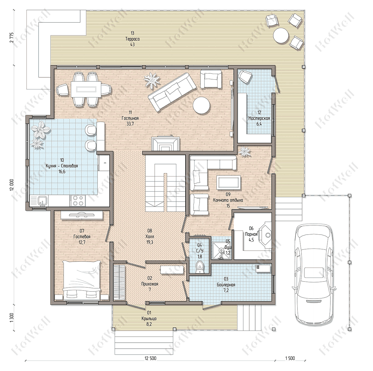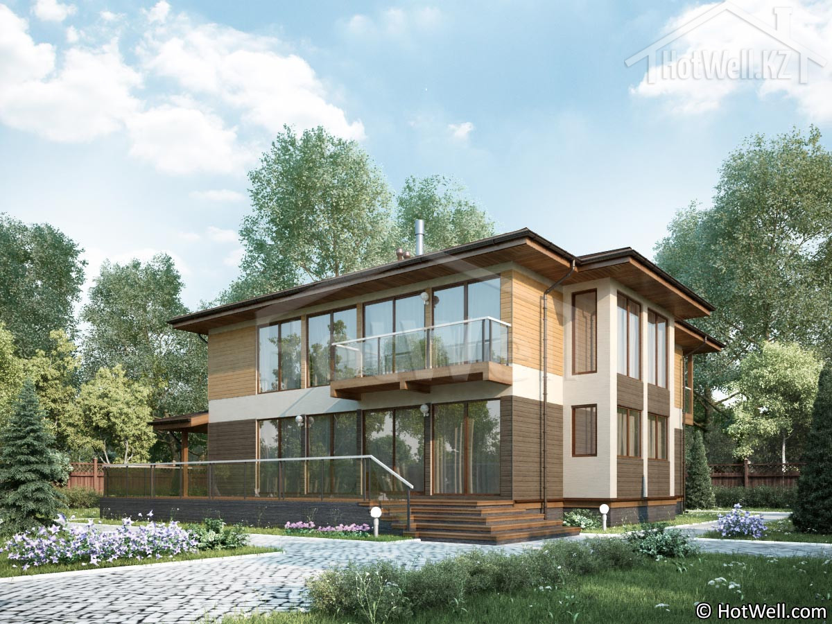 Двухэтажный дом 16 на 14 метров, общей площадью 350 м2, из СИП панелей, с сауной, бойлерной, террасой, балконом, вторым светом и спальней на первом этаже.