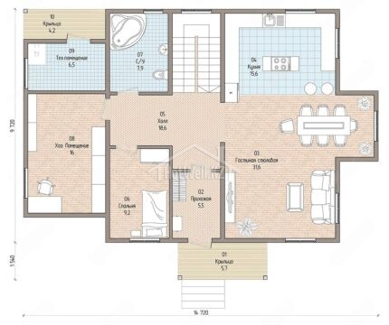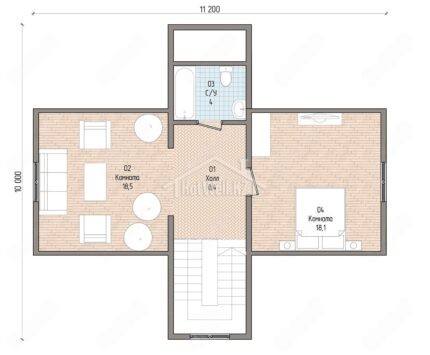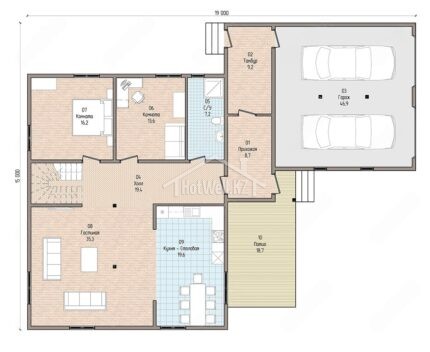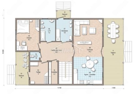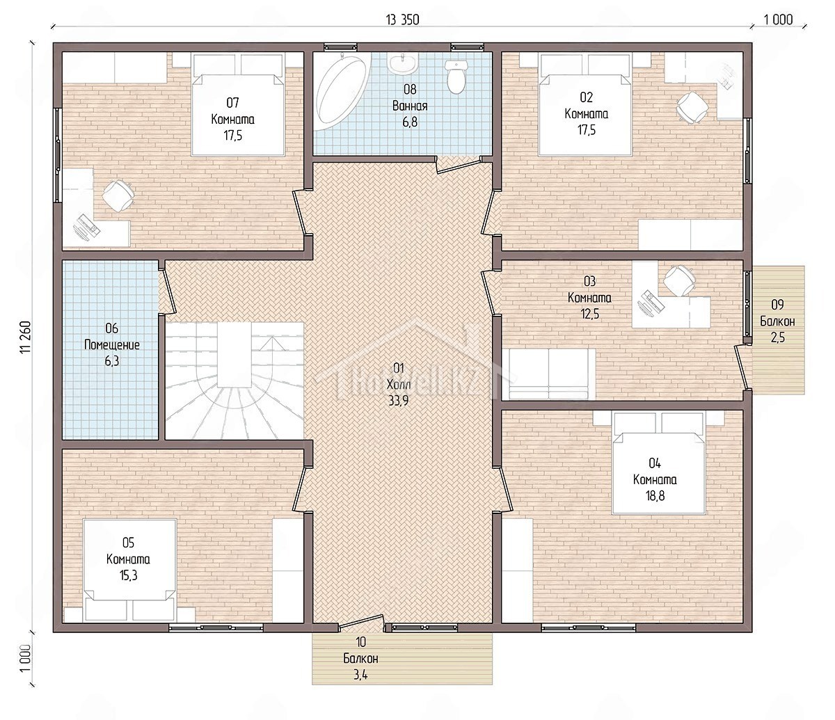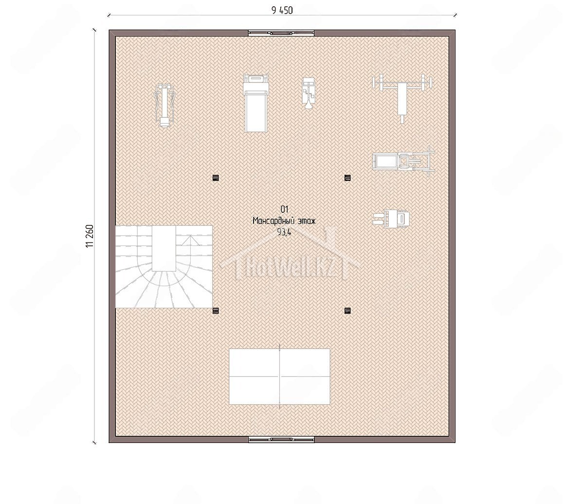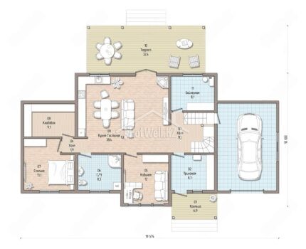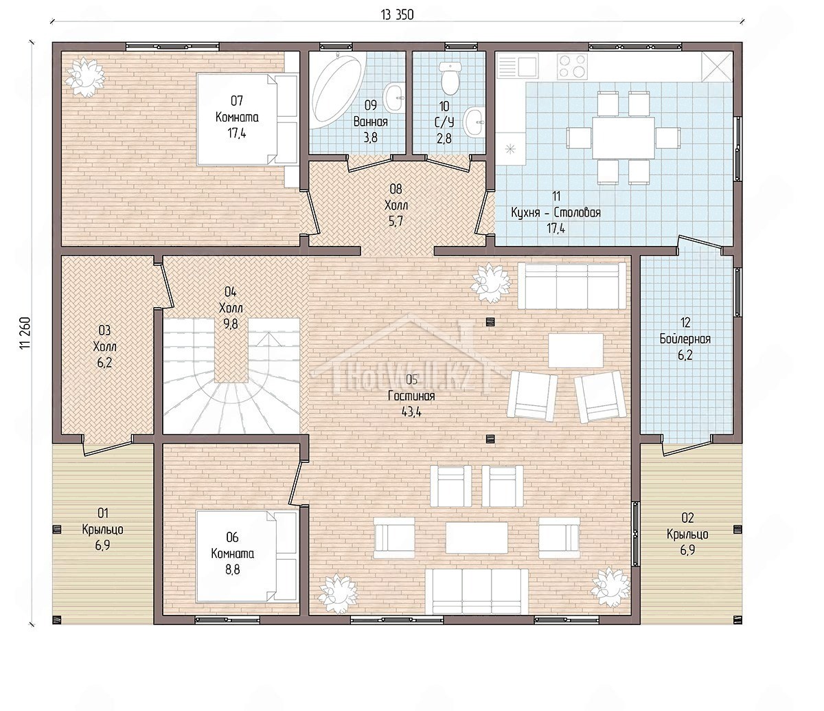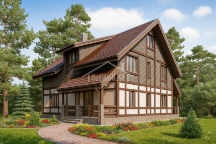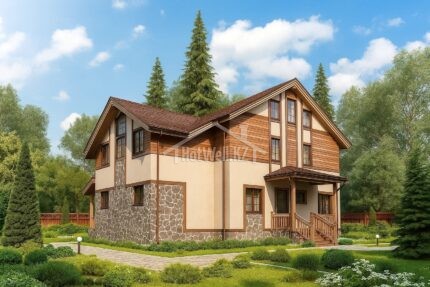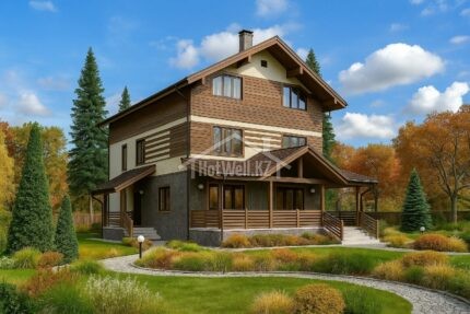 Трехэтажный дом 13 на 11 метров, общей площадью 413 м2, из СИП панелей, с бойлерной, балконом и спальней на первом этаже.
