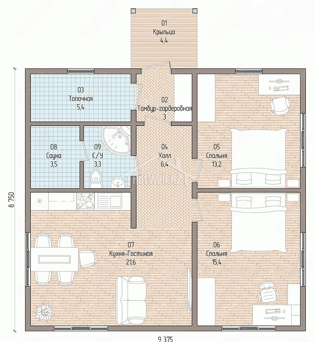 Одноэтажный дом 11 на 9 метров, общей площадью 86 м2, из СИП панелей, с сауной, бойлерной и спальней на первом этаже.