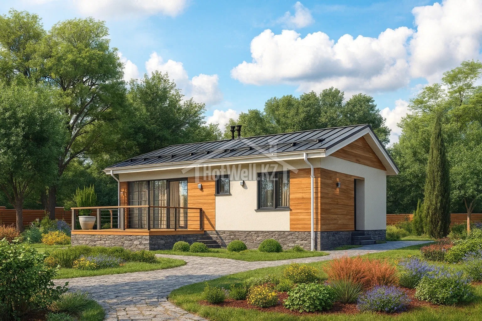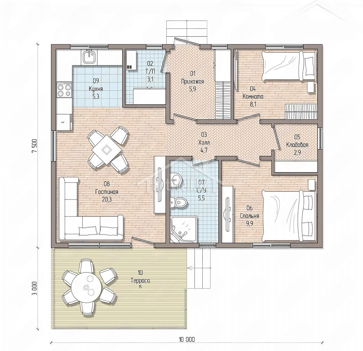 Одноэтажный дом 11 на 10 метров, общей площадью 90 м2, из СИП панелей, с бойлерной, террасой и спальней на первом этаже.