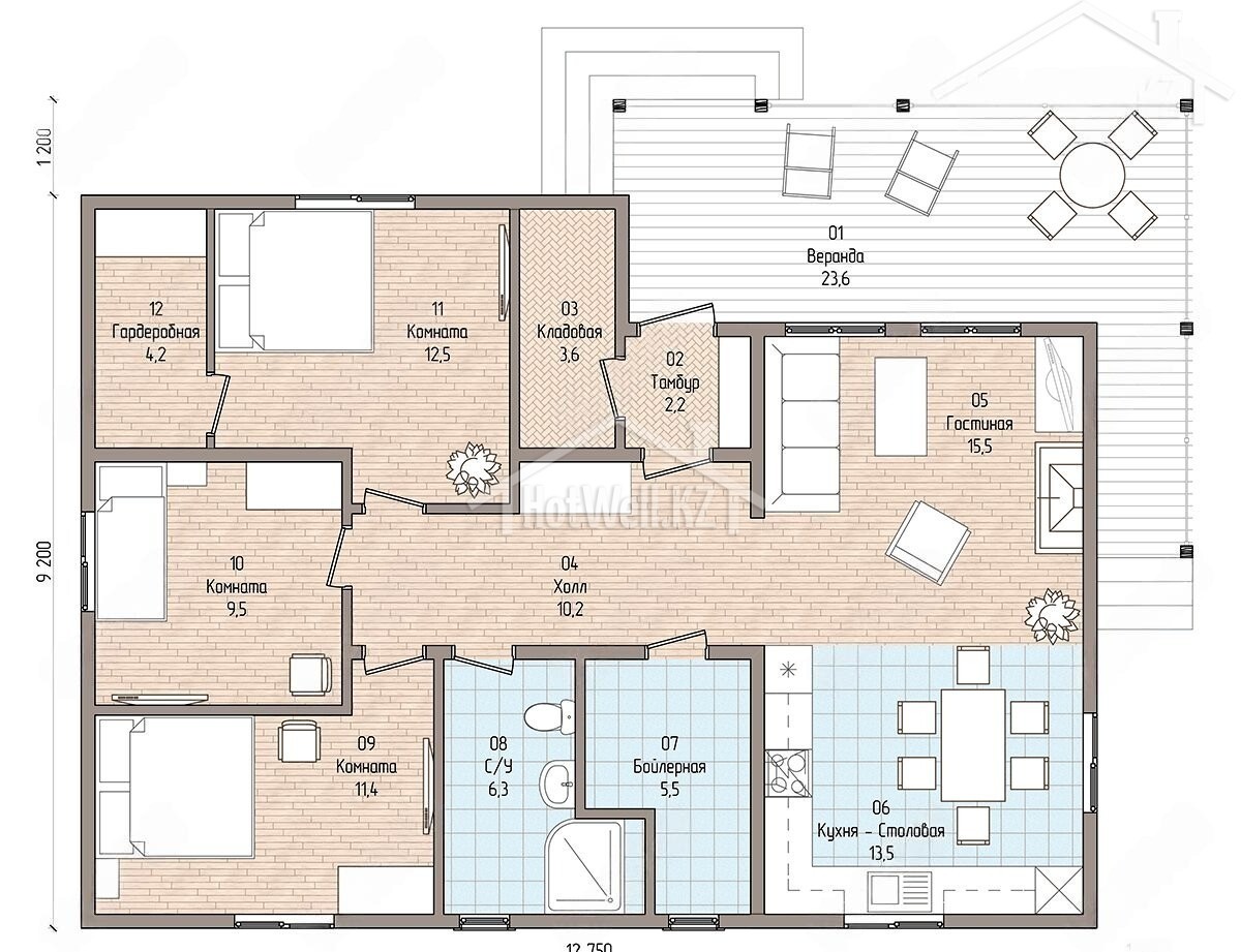 Одноэтажный дом 14 на 10 метров, общей площадью 131 м2, из СИП панелей, с бойлерной, террасой и спальней на первом этаже.
