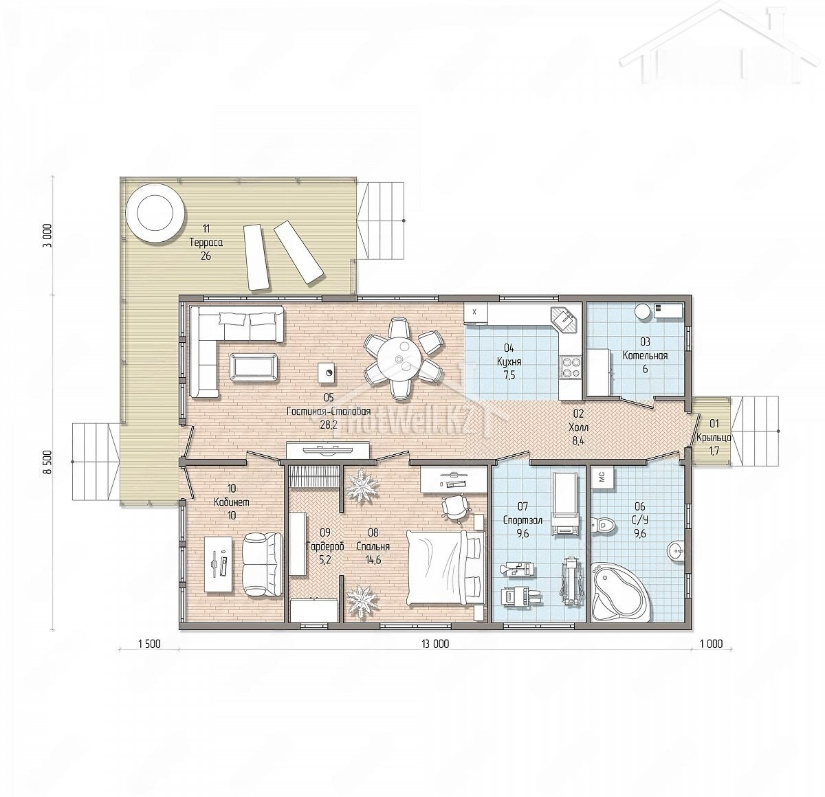 Одноэтажный дом 16 на 12 метров, общей площадью 138 м2, из СИП панелей, с бойлерной, террасой и спальней на первом этаже.